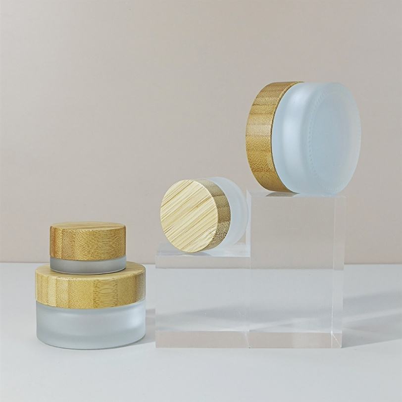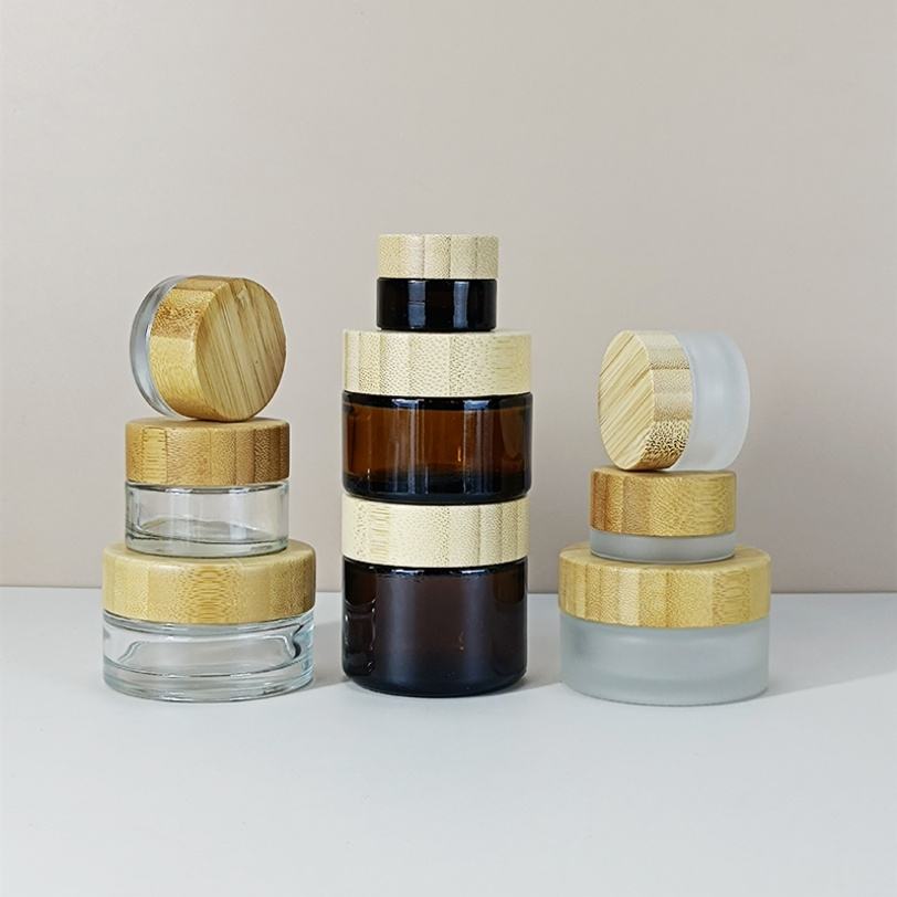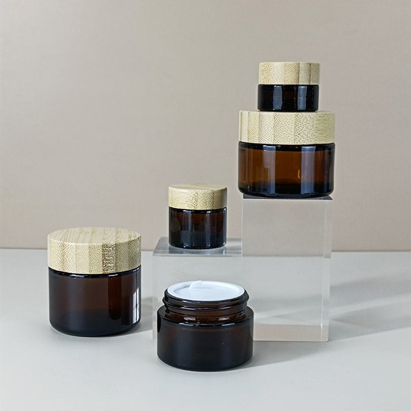 ขวดแก้วสีชาขนาด 1 ออนซ์ 1.7 ออนซ์ 2 ออนซ์ บรรจุภัณฑ์เครื่องสำอางแบบกลม ขนาด 5 กรัม 10 กรัม 20 กรัม 30 กรัม 50 กรัม 60 กรัม 100 กรัม พร้อมฝาไม้ไผ่สำหรับบรรจุครีม