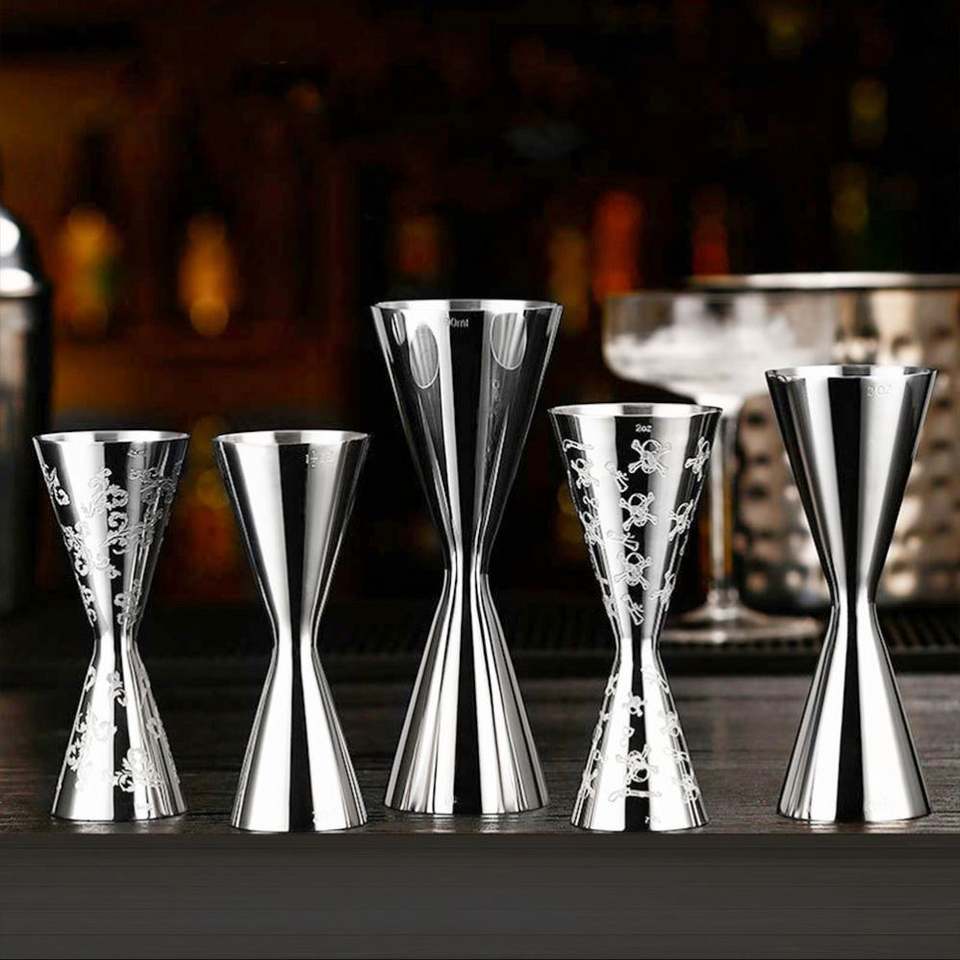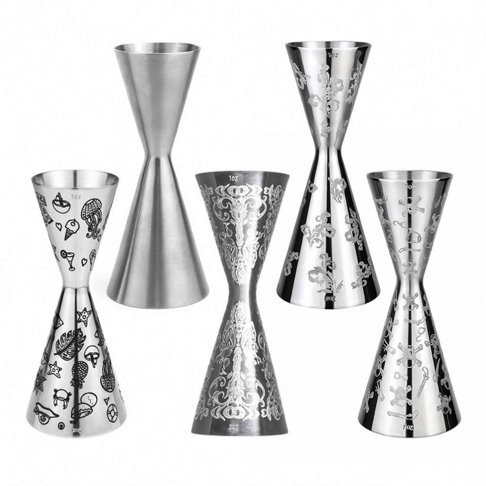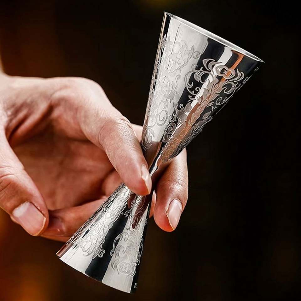 จิกเกอร์บาร์ค็อกเทลแบบสลักลาย ขนาด 1 ออนซ์/2 ออนซ์ ยี่ห้อ Mr.Slim ผลิตจากสแตนเลส 304 สำหรับบาร์เทนเดอร์ พร้อมขีดบอกปริมาตร