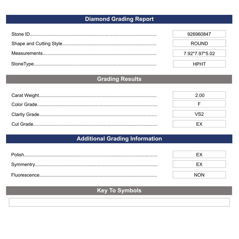 เพชรทรงกลมเจียระไนแบบบริลเลียนท์ น้ำหนัก 2.0 กะรัต ความสะอาดระดับ VS2 ผลิตในห้องปฏิบัติการ พร้อมการขัดเงา/เจียระไนระดับ EX สี F ได้รับการรับรองจาก IGI # 926960847