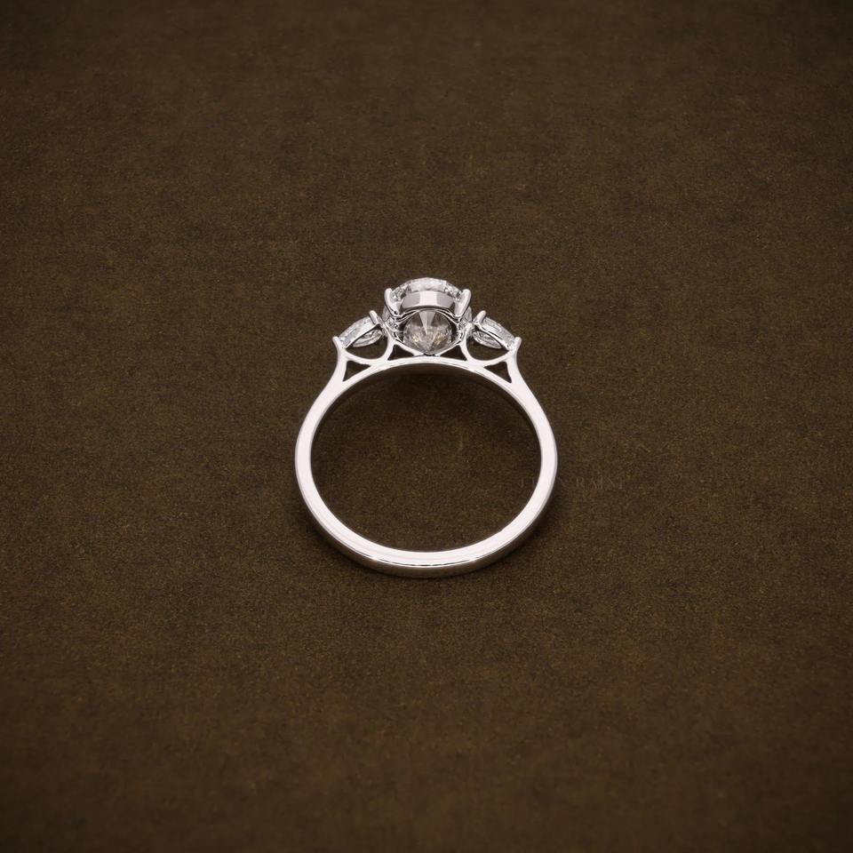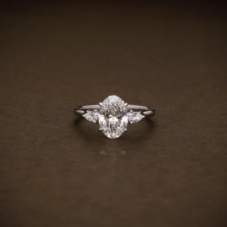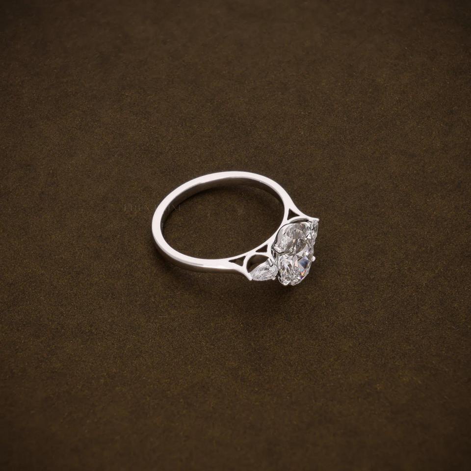 แหวนหมั้นเพชรทรงรี 2.00 กะรัต เพชรเลี้ยงในห้องปฏิบัติการ ระดับความสะอาด F VVS ประดับเพชรทรงลูกแพร์สองเม็ด แหวนเพชรสามเม็ด ได้รับการรับรองจาก IGI แหวนครบรอบ
