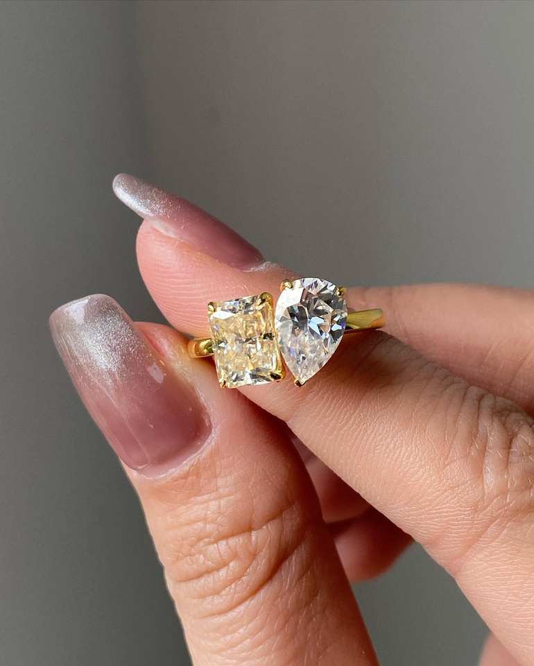 แหวนหมั้นเพชรแบบคู่ประดับ VS1โรเดียมลูกแพร์สีทอง18K แหวนหมั้นเพชรสำหรับงานแต่งงานในห้องปฏิบัติการ2.01CT