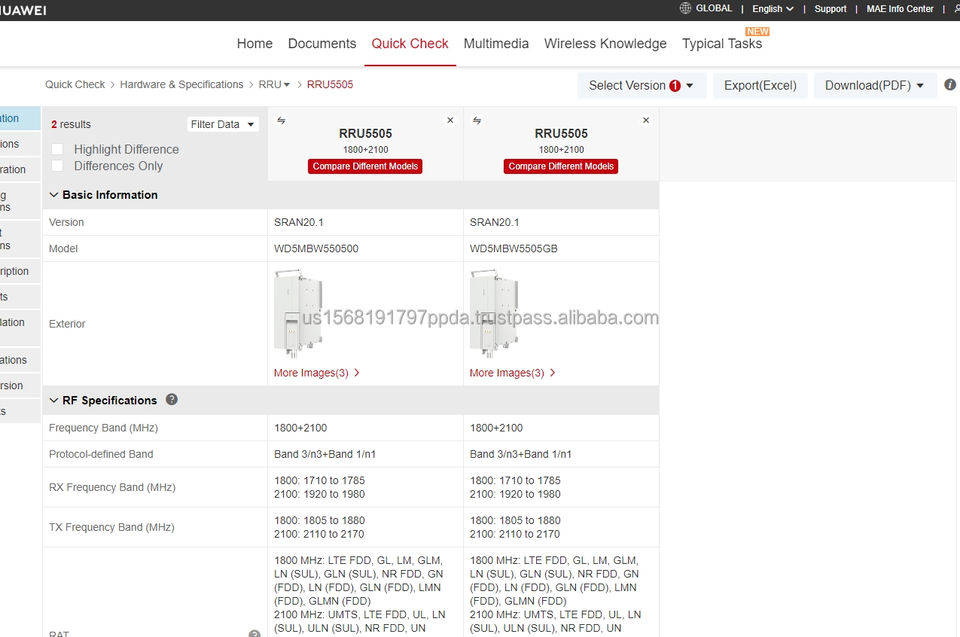 2*120W HW rru แบบ multi-Mode 1800MHz ~ 2100MHz LTE NR โมเดลอุปกรณ์โครงสร้างพื้นฐานไร้สายของ WD5MZAANHAAL 02312FLG