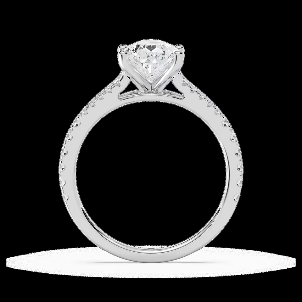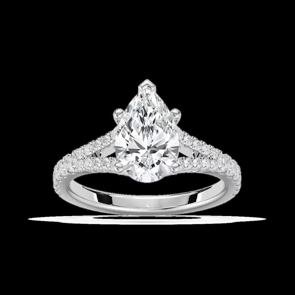 แหวนหมั้นเพชรทรงลูกแพร์ 2.25 กะรัต ผลิตในห้องปฏิบัติการ ดีไซน์วงแหวนแบบแยกส่วน ประดับเพชรแบบปาเว่ ได้รับการรับรองจาก IGI ทองคำแท้ 14K