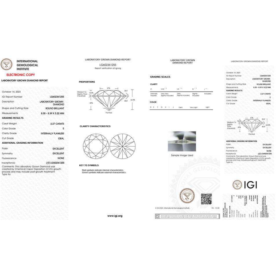 เพชรทรงกลม 2.27 กะรัต ผลิตในห้องปฏิบัติการ คุณภาพ IF/E ทรงเจียระไนเยี่ยม ความสะอาดระดับ VS2 สำหรับทำเครื่องประดับ ได้รับการรับรองจาก IGI