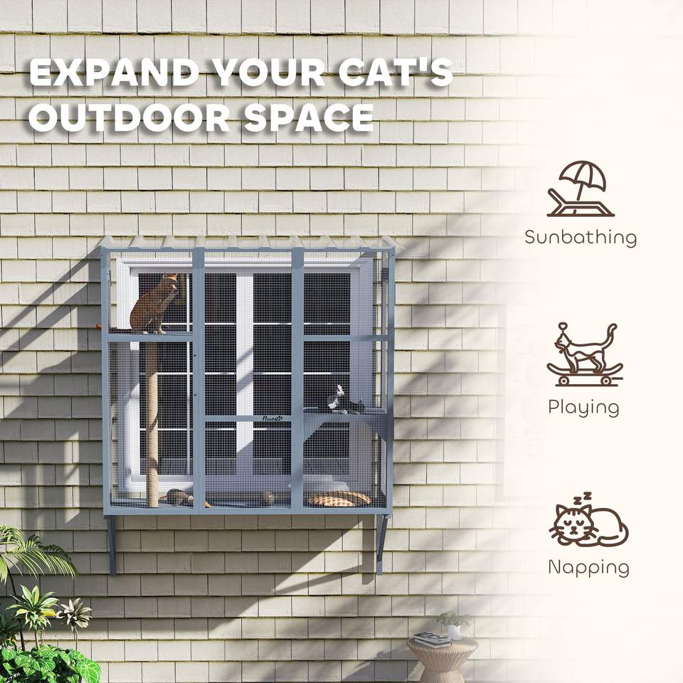 หน้าต่างแคททัวร์สำหรับแมวขนาดใหญ่ 2-3 ตัว พร้อมแท่นกระโดด 2 ที่ และเสาข่วนเล็บสำหรับเล่นและงีบหลับ