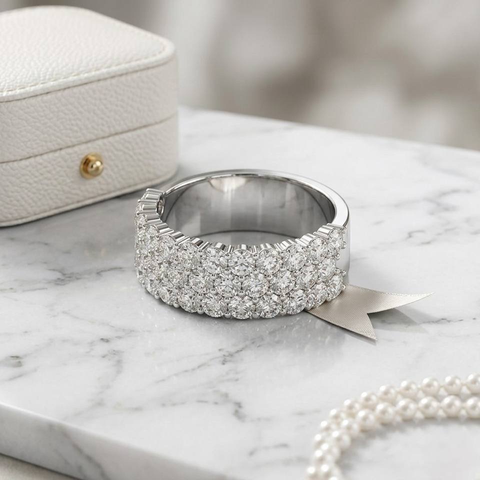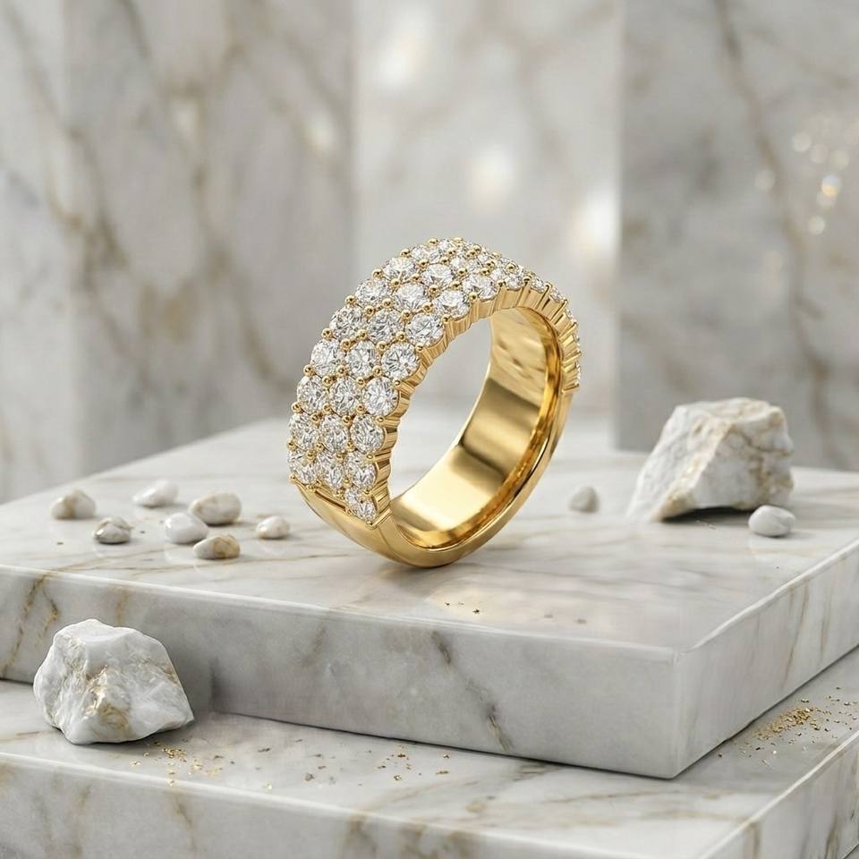 แหวนเพชรทรงบริลเลียนต์สี E น้ำหนัก 2.30 กะรัต ผลิตในห้องปฏิบัติการ ฝังแบบสามแถว ประดับเพชรแบบพาเว่ ได้รับการรับรองจาก IGI แหวนทองคำ 10K ดีไซน์หรูหราสำหรับงานหมั้น