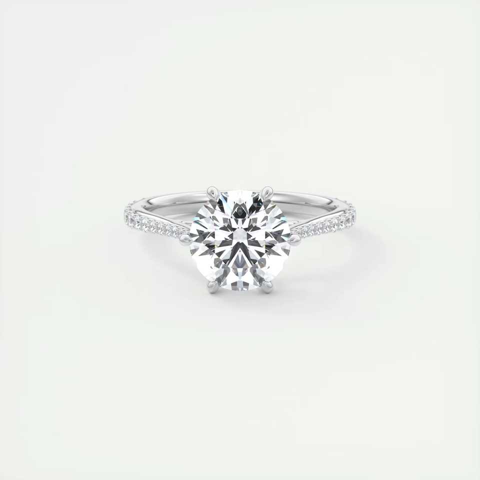 แหวนหมั้นเพชรทรงกลม 2.30 กะรัต เพชรเลี้ยงในห้องปฏิบัติการ ทรงหกเหลี่ยม ประดับเพชรแบบพาเว่ พร้อมเพชรเม็ดเดี่ยวสามสิบเอ็ดเม็ด