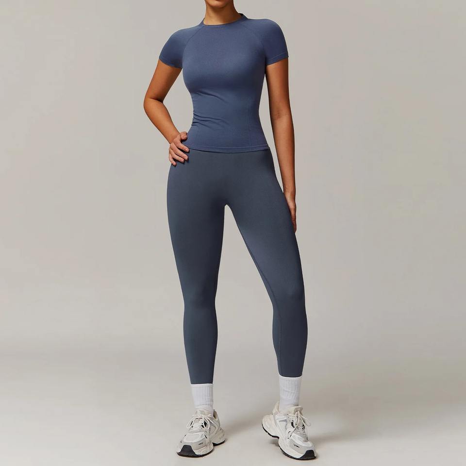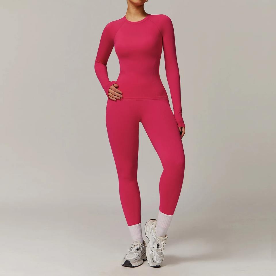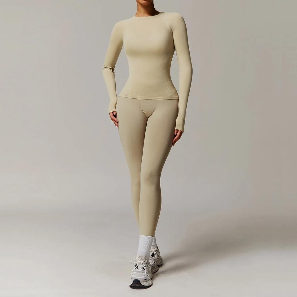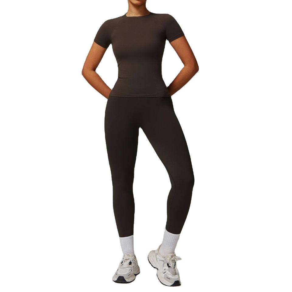 ชุดโยคะไร้รอยต่อของผู้หญิงเลกกิ้งเอวสูงลายพื้นและเสื้อครอปแขนยาวสำหรับออกกำลังกายและออกกำลังกาย
