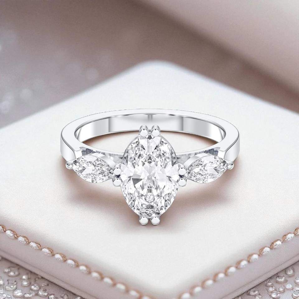 แหวนหมั้นเพชรโมอิสซาไนต์ทรงมาร์ควิสและทรงวงรี น้ำหนัก 2.40 กะรัต สี E-F/VVS-VS ประดับเพชร 3 เม็ด ตัวเรือนแพลตตินั่ม สำหรับเธอ