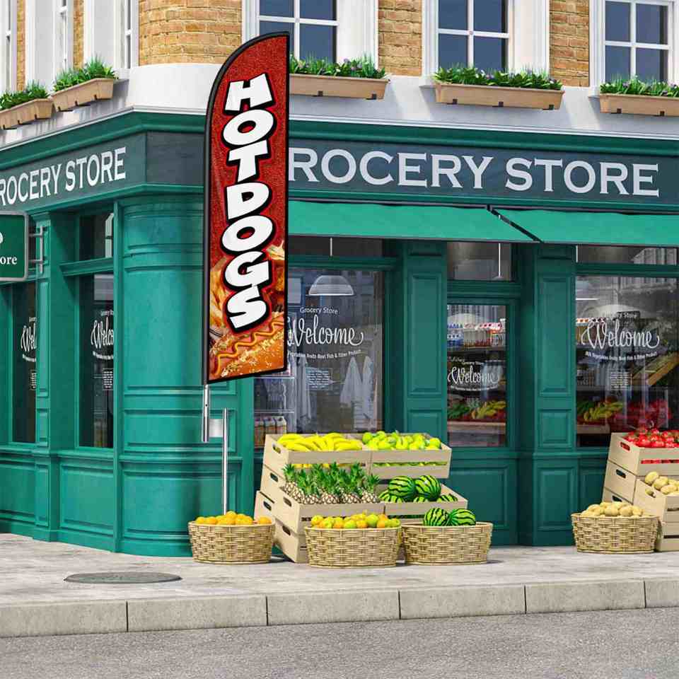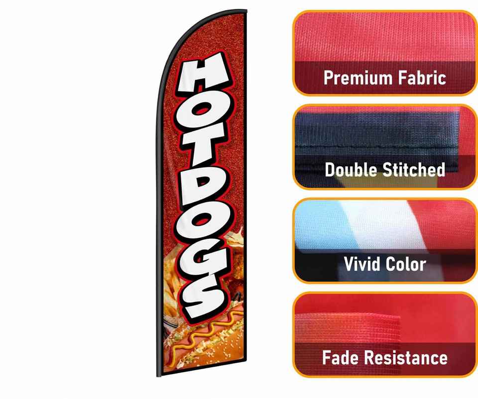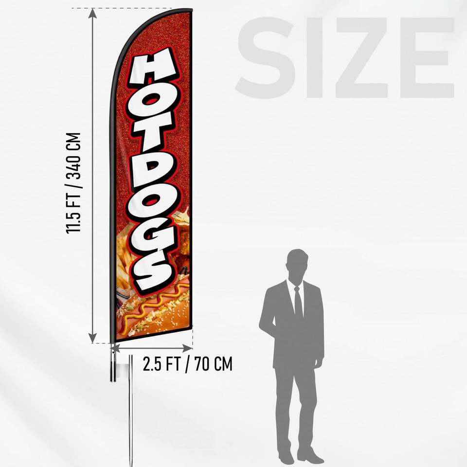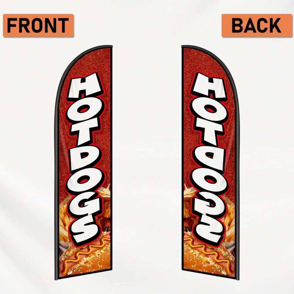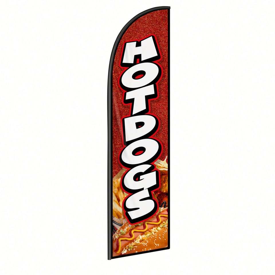 ธงขนนกแบบกำหนดเองคุณภาพสูงขนาด 2.5*11.5 ฟุต ลายฮอทดอก สำหรับงานปาร์ตี้ชายหาดและการโฆษณาประชาสัมพันธ์