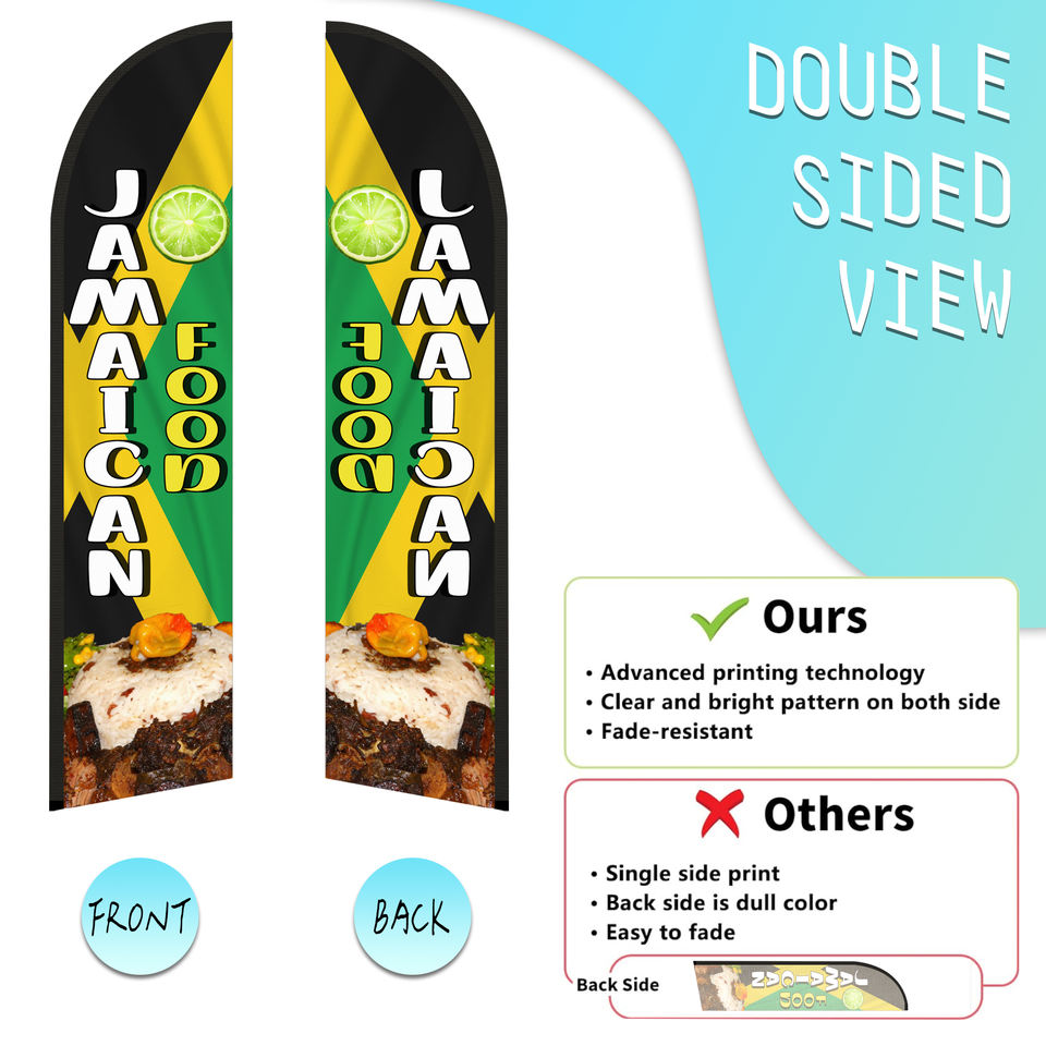 ธงขนนกแบบกำหนดเองคุณภาพสูง ขนาด 2.5*11.5 ฟุต ลายอาหารจาเมกา ธงชายหาดสำหรับงานปาร์ตี้ริมชายหาดและการโฆษณาส่งเสริมการขาย