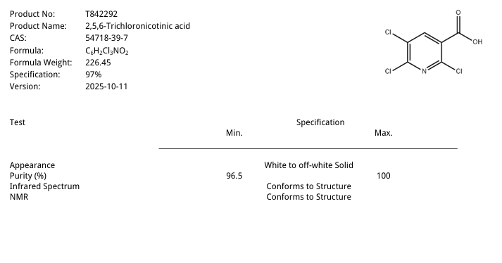 กรดทริคลอโรนิโคนิก 2,5,6- หมายเลข CAS 54718-39-7 วัสดุสำหรับการสังเคราะห์ สารอินเตอร์มีเดียต ความบริสุทธิ์ 97% รูปแบบของแข็ง MF C6H2Cl3NO2 LAIBOTECH