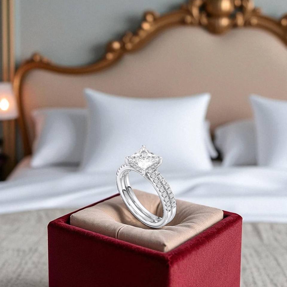 แหวนหมั้นเพชรที่โตในแล็บ2.50 CT F-G/VS กับเจ้าหญิง2.00 CT และวงแหวนตัดสีทองล้วนสำหรับผู้หญิง