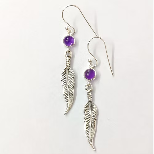 ต่างหูเงินแท้ 925 ประดับอเมทิสต์ ดีไซน์ขนนกแบบโบโฮ | ผู้จัดจำหน่ายเครื่องประดับทำมือขายส่ง