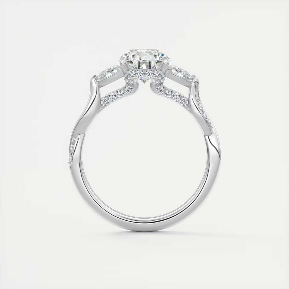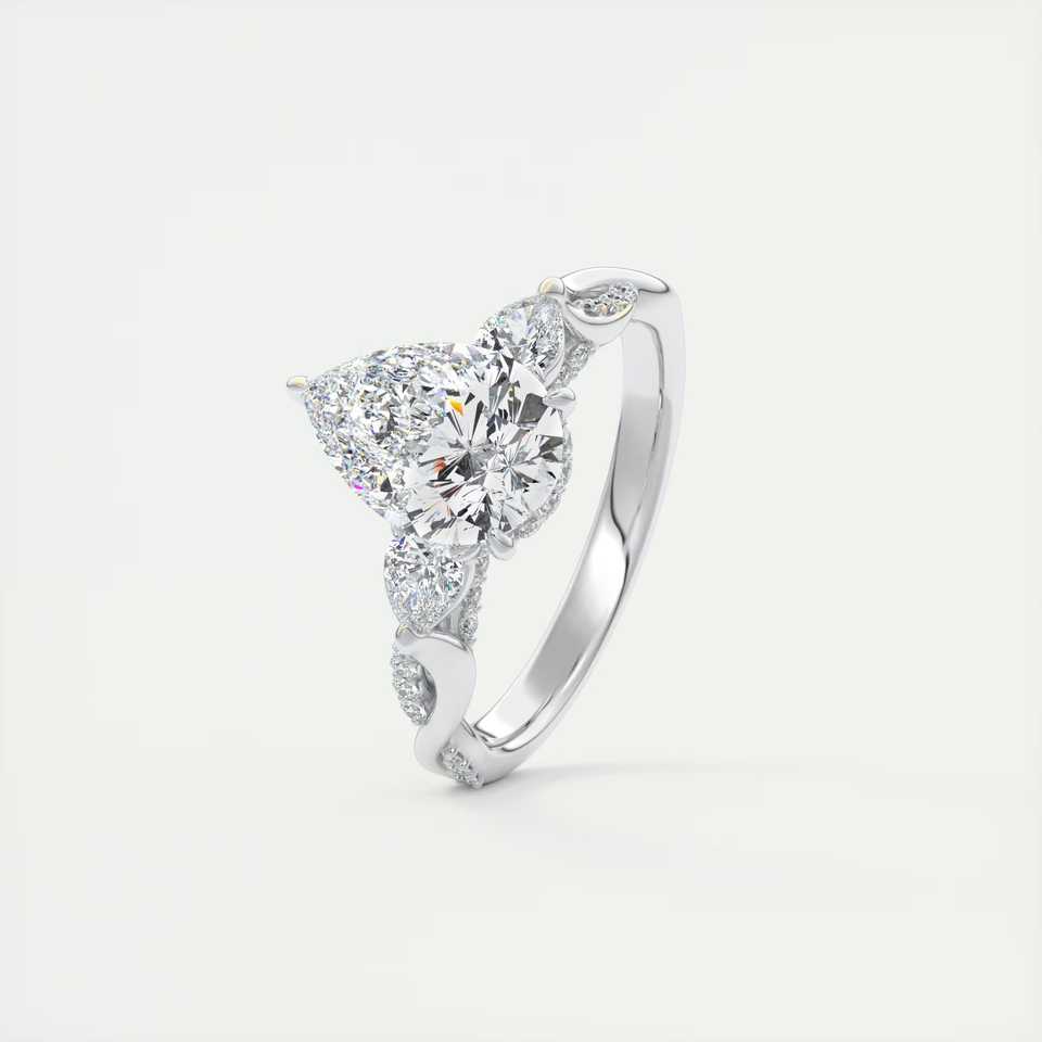 แหวนหมั้นเพชรทรงลูกแพร์ 2.75 กะรัต เพชรเลี้ยงในห้องปฏิบัติการ สามเม็ด ตัวเรือนทองคำขาว 14K ด้านข้างทรงกลม