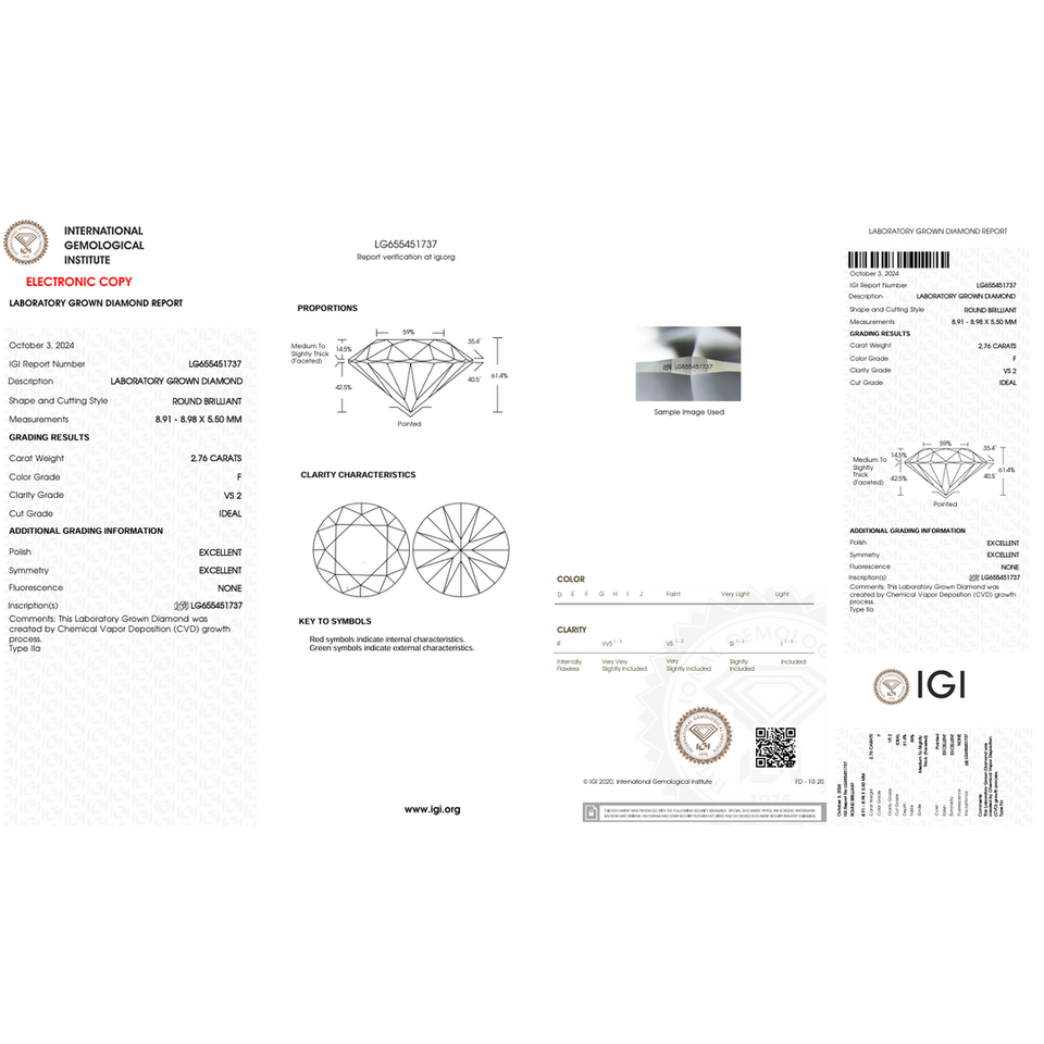 เพชรทรงกลม 2.76 กะรัต ผลิตในห้องปฏิบัติการ ความสะอาดระดับ VS2 ขัดเงาอย่างดี เหมาะสำหรับทำเครื่องประดับ ได้รับการรับรองจาก IGI