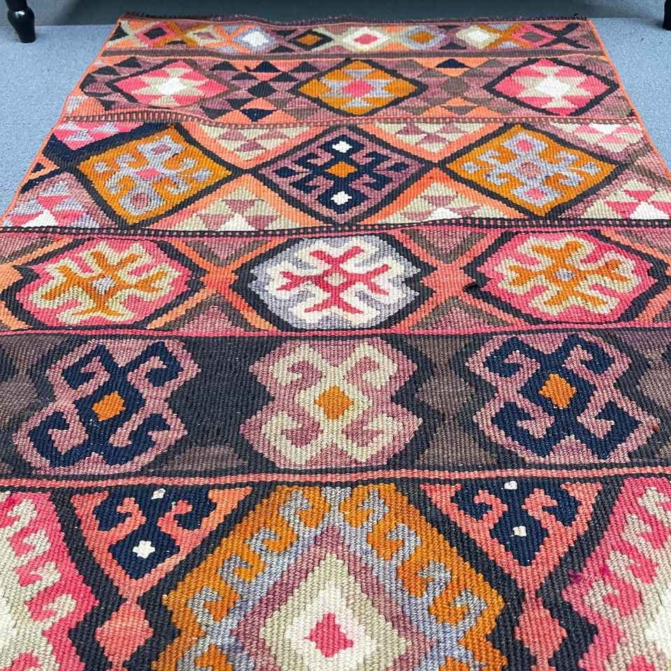 พรมวินเทจตุรกีขนาด 2.7x11.3 ฟุต, พรมลายทาง, พรมลายสัตว์สีแดง