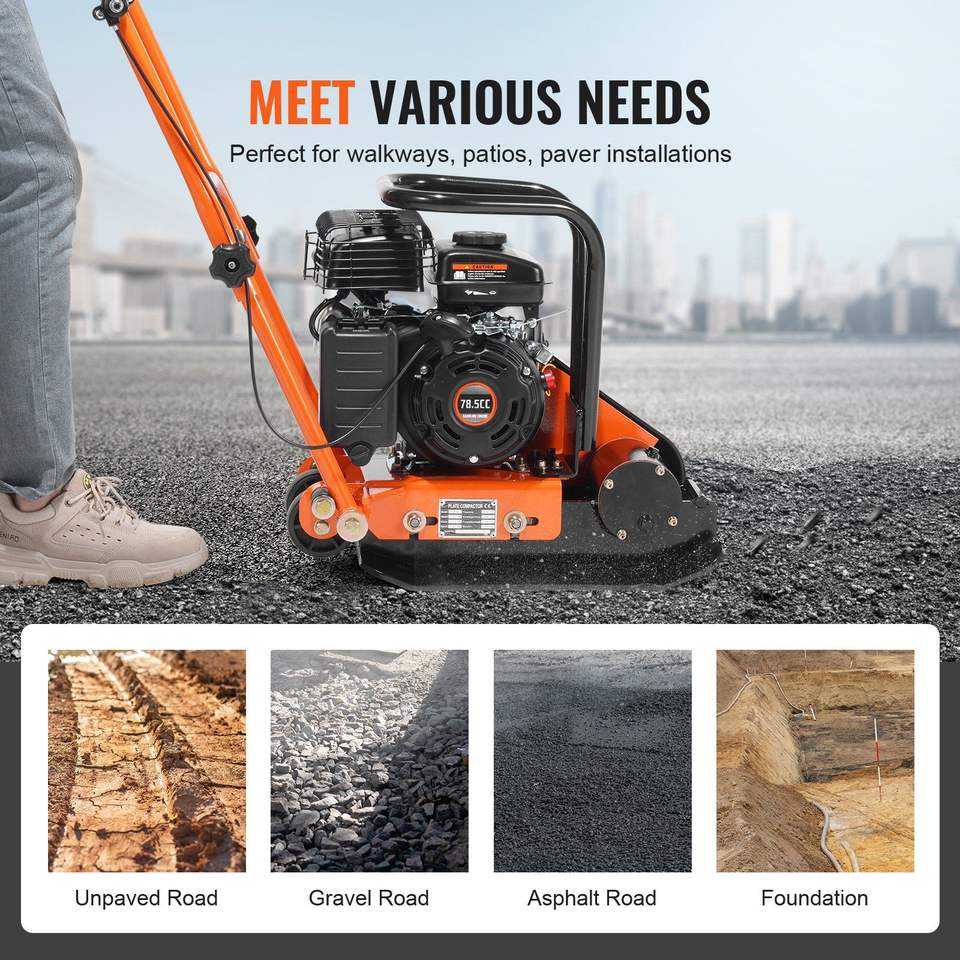 เครื่องบดอัดดินแบบแผ่น 2.8 แรงม้า 98 ซีซี เครื่องยนต์เบนซิน 5,250 รอบต่อนาที แรงสั่นสะเทือน 1,920 ปอนด์ แผ่นขนาด 18.7 x 11.8 นิ้ว 5,250 รอบต่อนาที