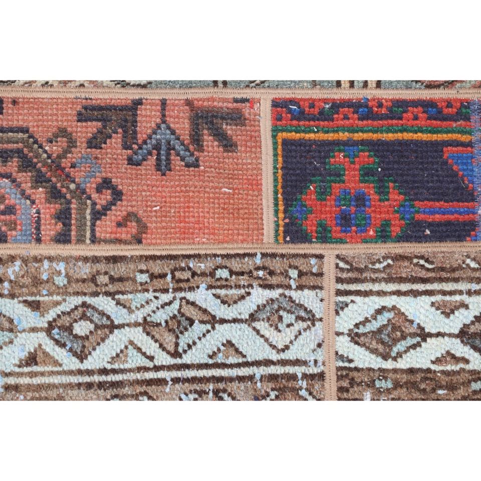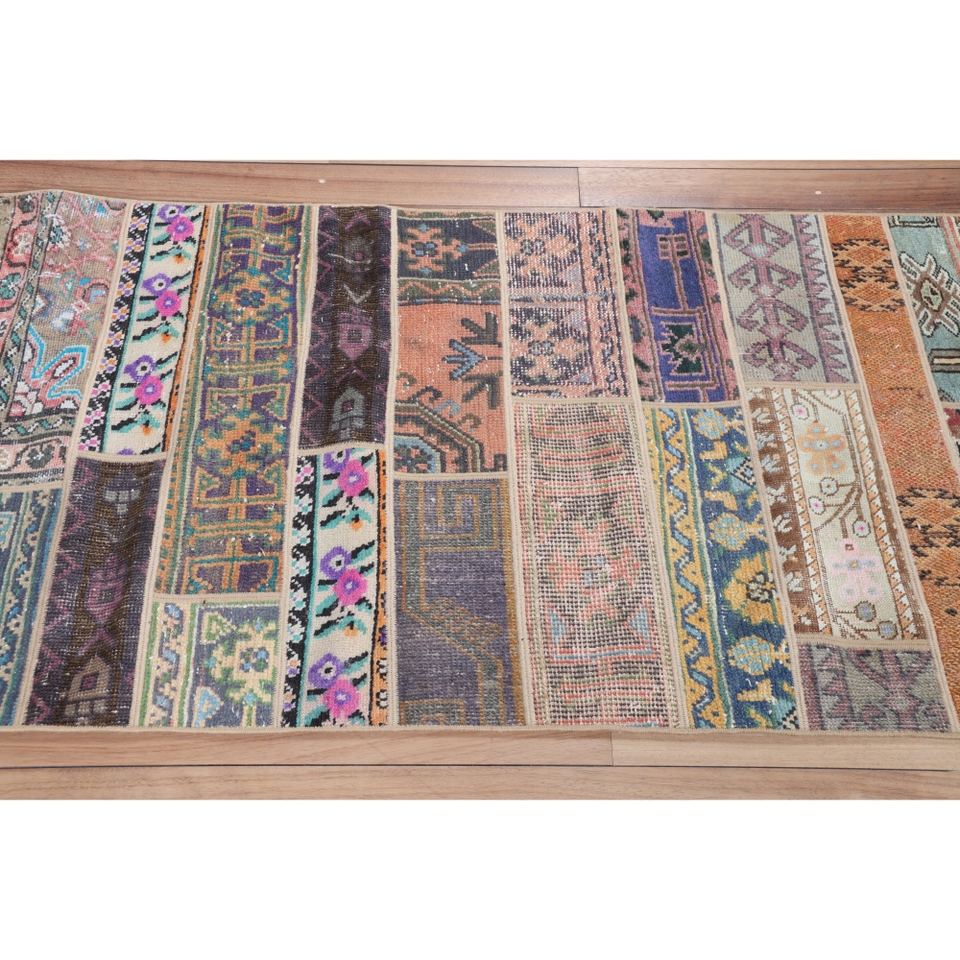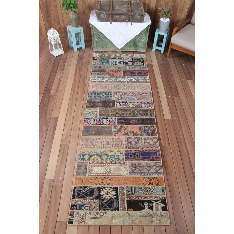 พรมตุรกีลายปะติดขนาด 2.8x8.7 ฟุต สีเบจ ลายเรขาคณิตสไตล์วินเทจ