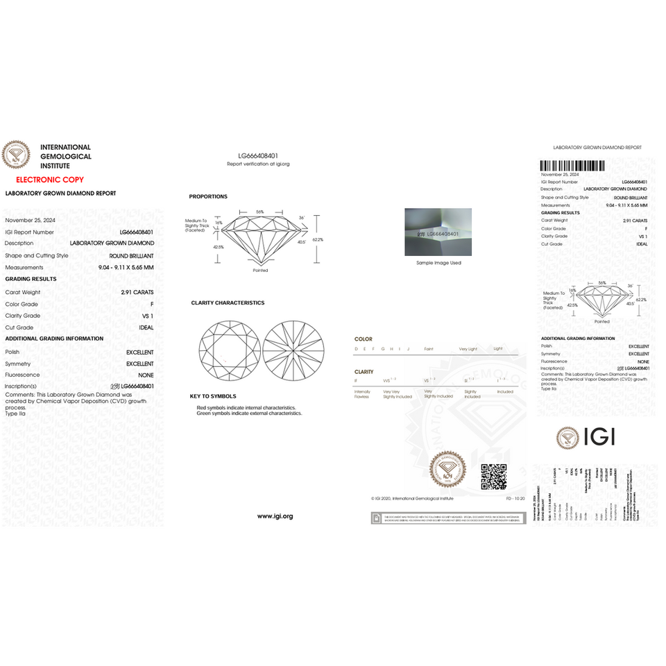 เพชรทรงกลม 2.91 กะรัต VS1/F เพาะเลี้ยงในห้องปฏิบัติการ ได้รับการรับรองจาก IGI ขัดเงาแบบ EX สำหรับแหวนเพชรที่หรูหรา