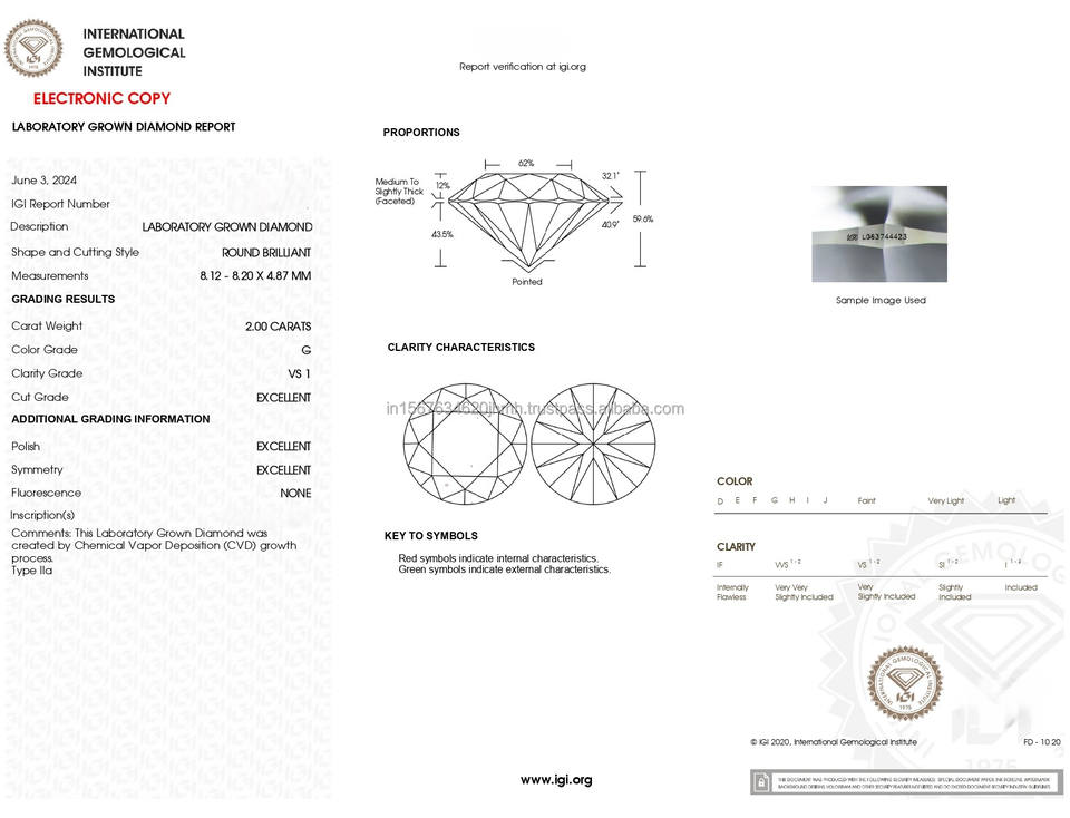 เพชรทรงกลม 2 กะรัต เกรด G VVS ผลิตในห้องปฏิบัติการด้วยวิธี HPHT คุณภาพสูง ความใส VS2 ทรงเจียระไนดี ได้รับการรับรองจาก IGI เพชรเม็ดเดี่ยว