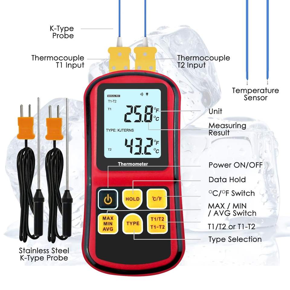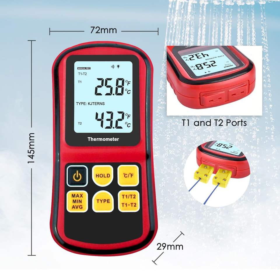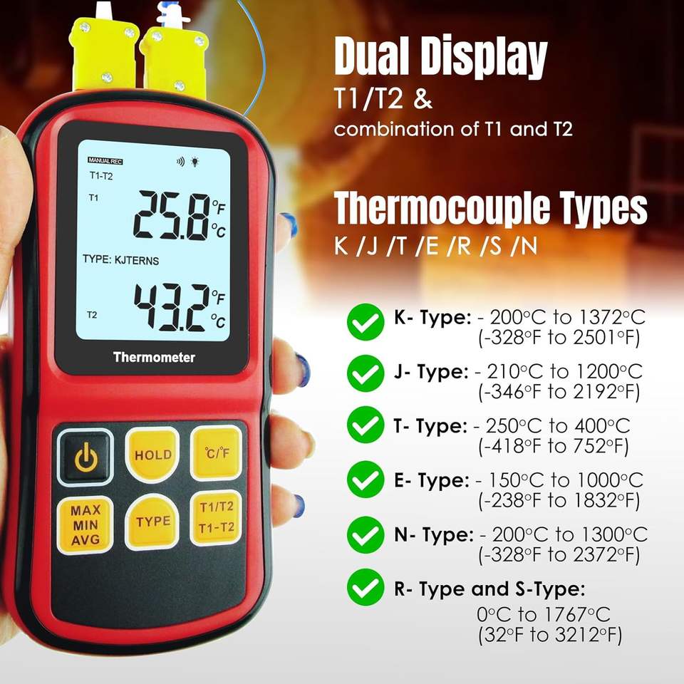 เครื่องวัดอุณหภูมิเทอร์โมคัปเปิล 2 ช่องสัญญาณ แบบ K/J/T/E/R/S/N | เครื่องวัดอุณหภูมิพร้อมหัววัดโลหะ 2 หัวและหัววัดแบบมีสาย 2 หัวสำหรับอุตสาหกรรมและห้องปฏิบัติการ