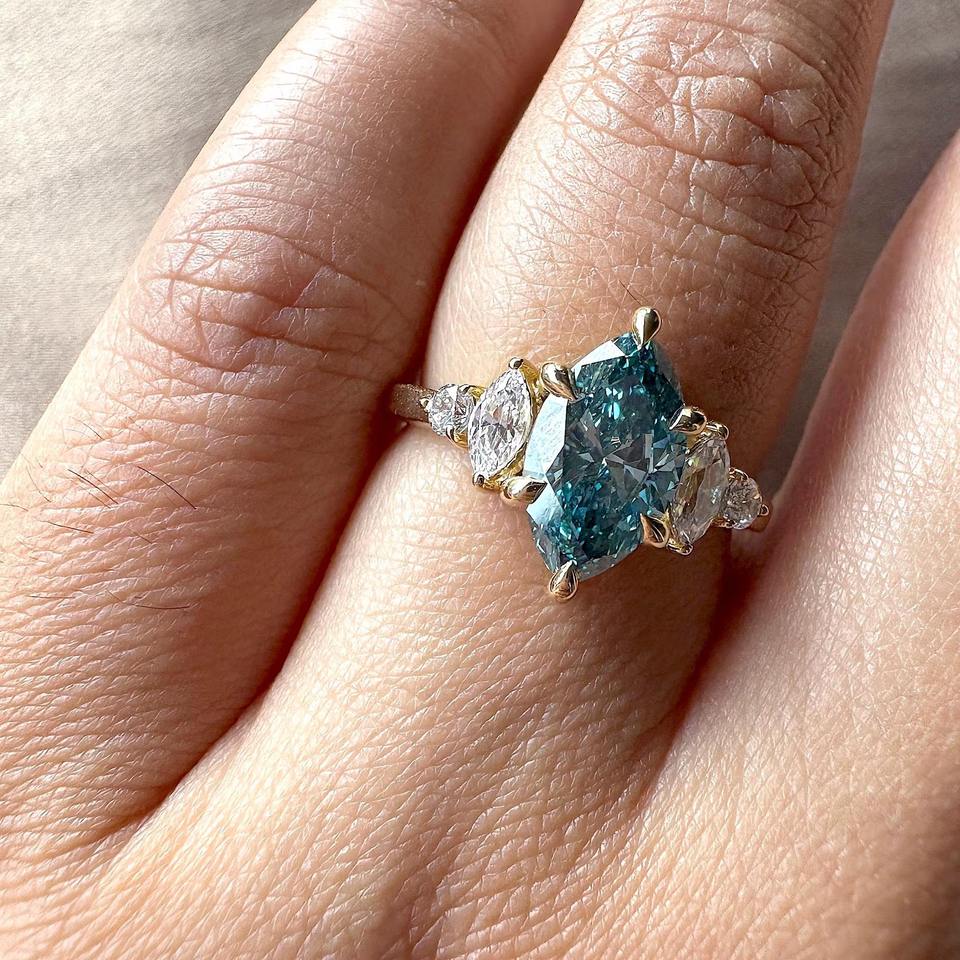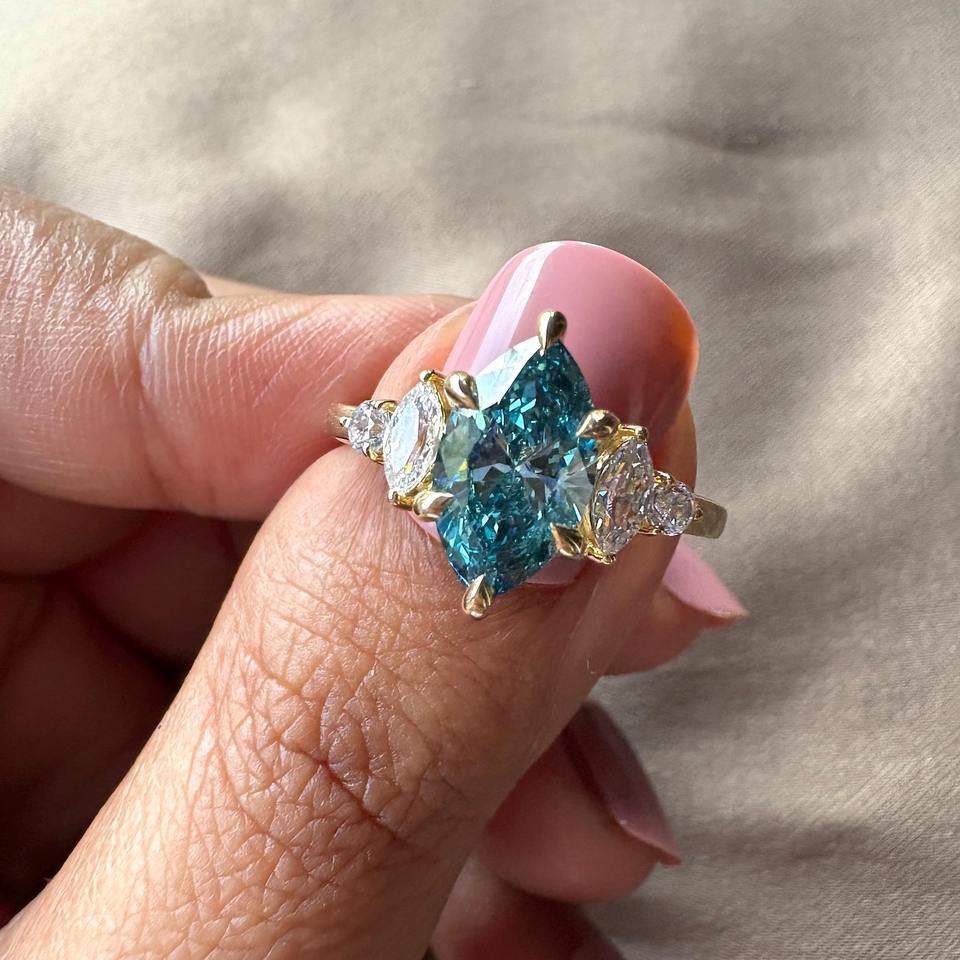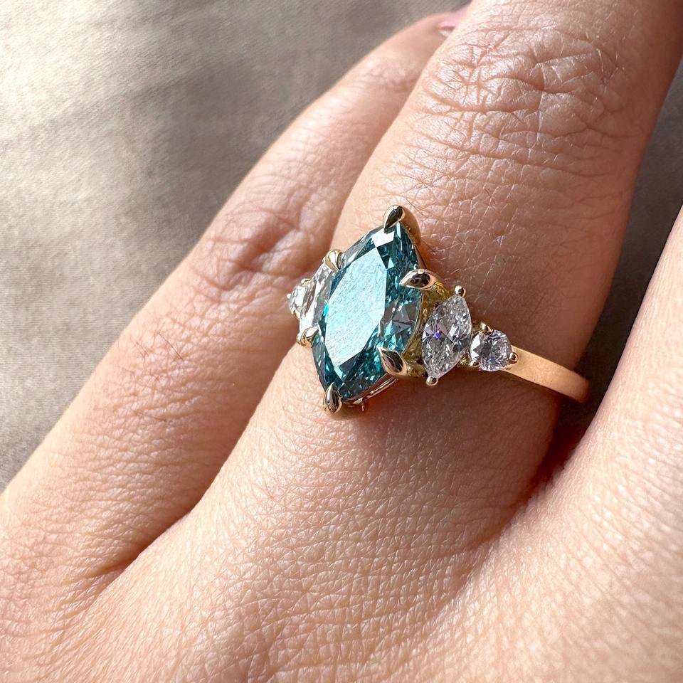 แหวนหมั้นเพชรทรงมาร์ควิสสีน้ำเงิน 2 กะรัต ผลิตในห้องปฏิบัติการ ตัวเรือนทอง 14k แหวนแต่งงานห้าเม็ดสำหรับผู้หญิง ราคาประหยัด