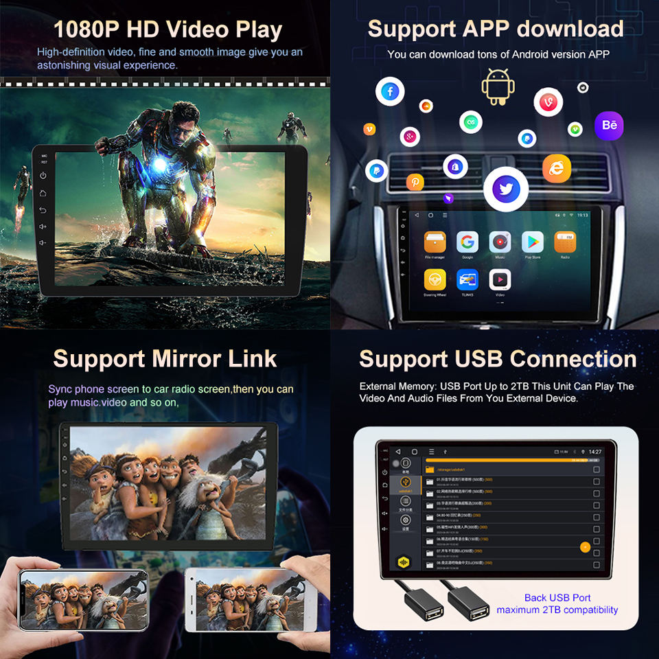 การรวมกัน:พอร์ตAUX, กล้องสำรอง, รองรับบลูทูธ, GPS ในตัว, DVR, FM Transmitter, เครื่องรับวิทยุ, ย้อนกลับAid, หน้าจอสัมผัส, HDMI เข้า/ออก, MP3/MP4 Players
