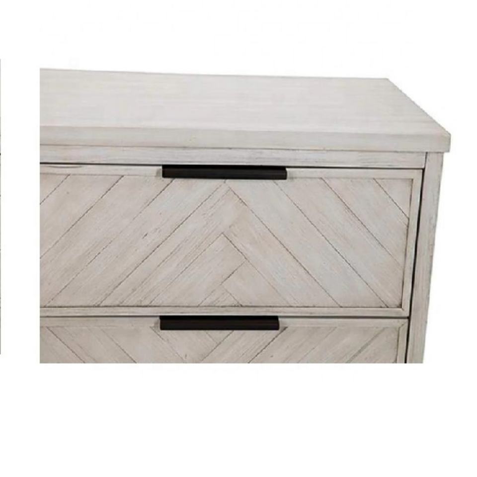 โต๊ะข้างเตียงไม้สไตล์วินเทจ 2 ลิ้นชัก พร้อมตกแต่งประตูแบบปาร์เก้ และฐานโลหะสีดำสำหรับห้องนอน