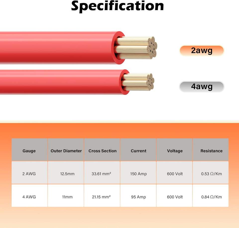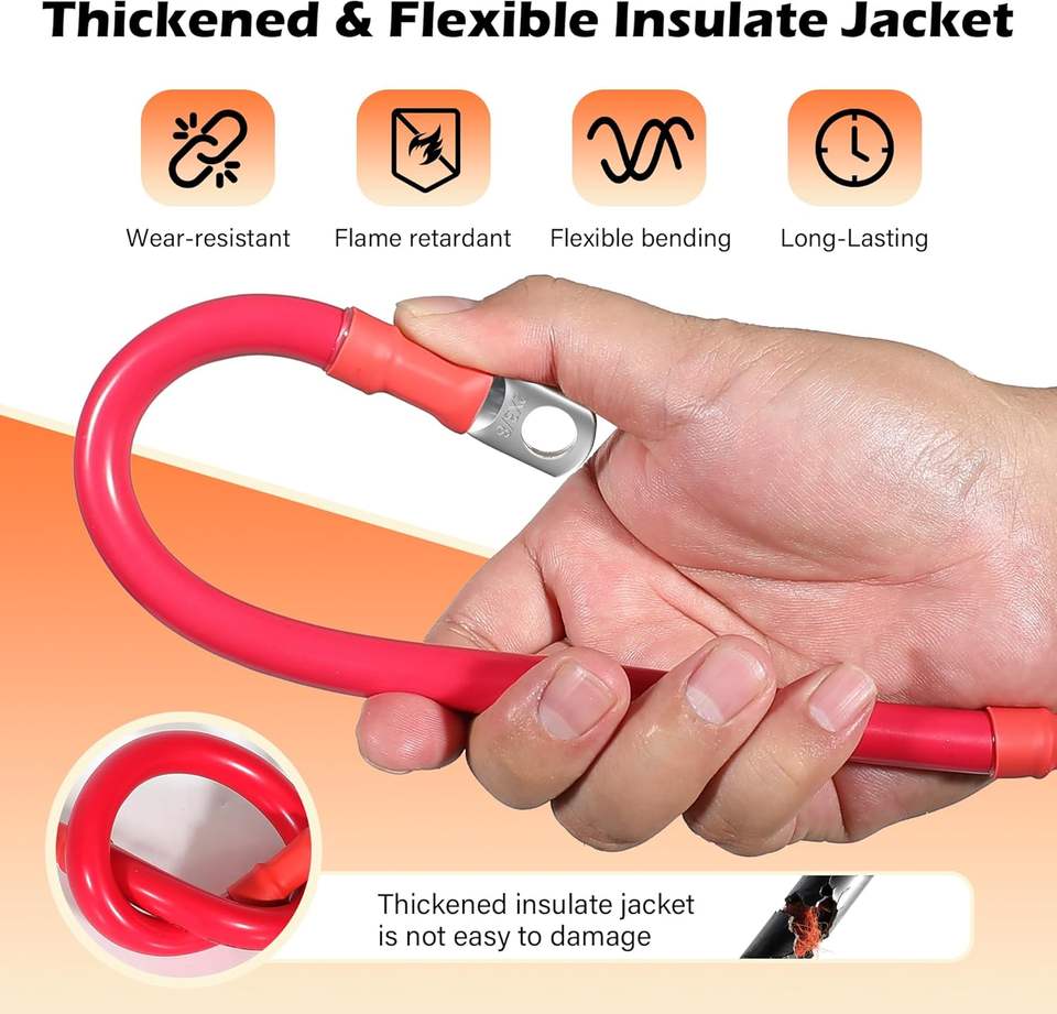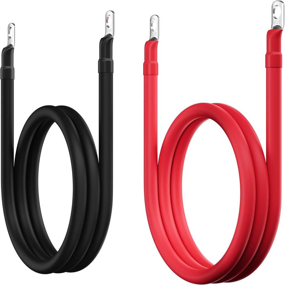 สายแบตเตอรี่ขนาด 2 เกจ AWG ยาว 2 ฟุต สีดำ+2 ฟุต สีแดง ชุดสายไฟทองแดงแท้สำหรับอินเวอร์เตอร์ พร้อมหัวต่อขนาด 3/8 นิ้วทั้งสองด้าน