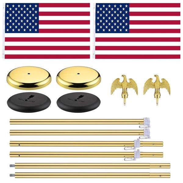 ชุดเสาธงในร่มแบบยืดหดได้ 2 ชิ้น ขนาด 6 ฟุต พร้อมหัวเสาอลูมิเนียมรูปนกอินทรีสีทอง และธงชาติสหรัฐอเมริกาปักลายดาวขนาด 3x5 ฟุต พร้อมฐานตั้งและแผ่นแสดงธง