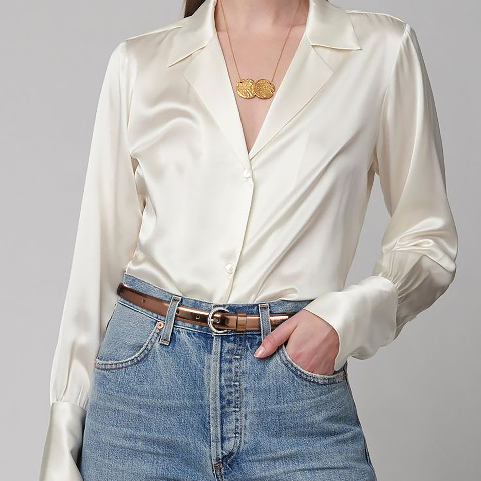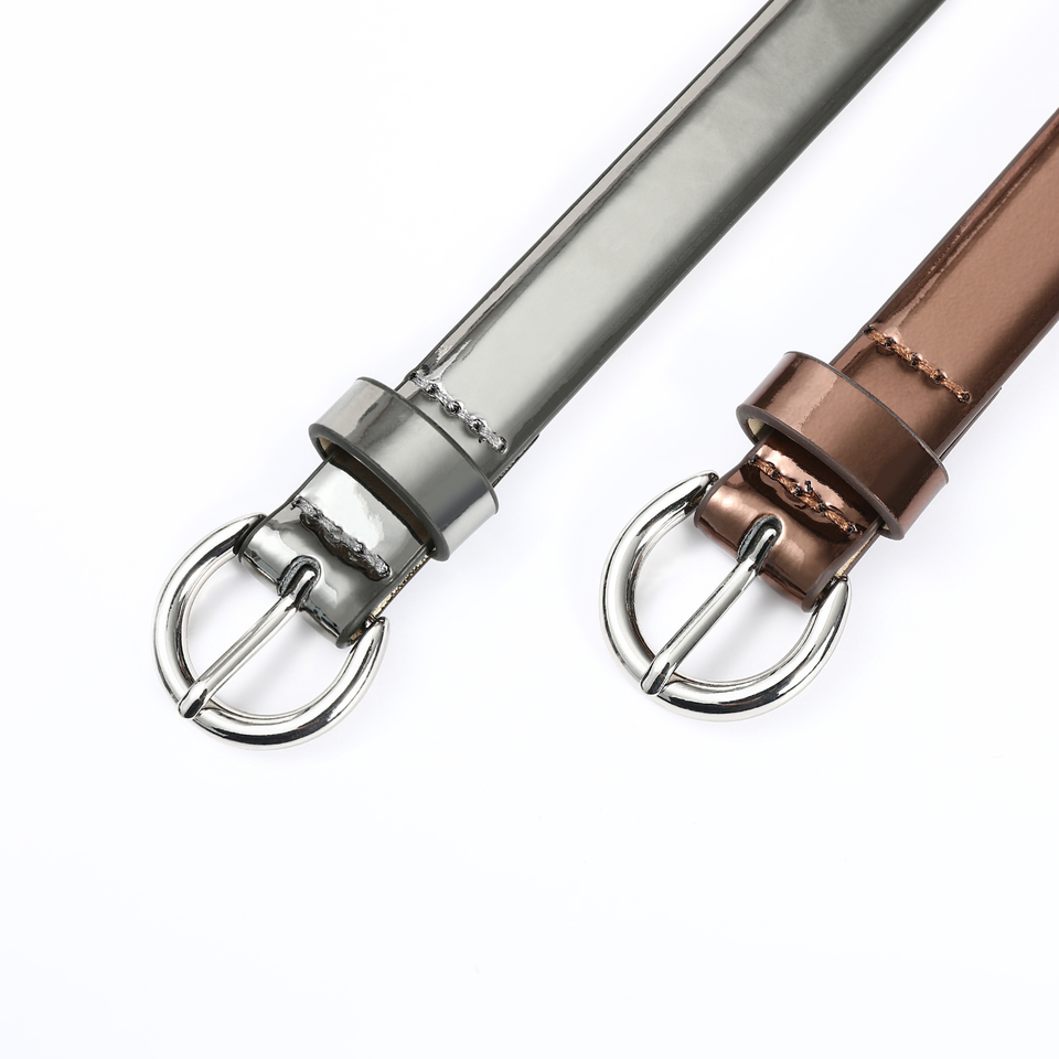 เข็มขัด PU แบบแพ็คคู่ สีดำ หนังแก้ว สำหรับผู้หญิง ความกว้าง 0.7 นิ้ว ความยาว 32-41 นิ้ว หัวเข็มขัดโลหะผสมสีเงิน KH