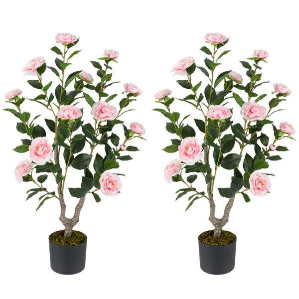ต้นคาเมลเลียประดิษฐ์สีส้มพร้อมดอกไม้สีชมพูบานผลิตภัณฑ์2แพ็ค
