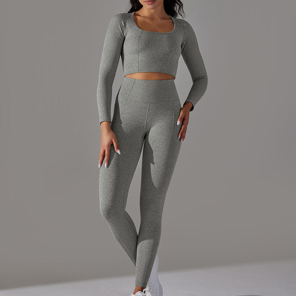 ชุดออกกำลังกายแขนยาว2ชิ้นสำหรับผู้หญิงเลกกิ้งออกกำลังกายฟิตเนสชุดเล่นโยคะโลโก้ออกแบบได้ตามต้องการ