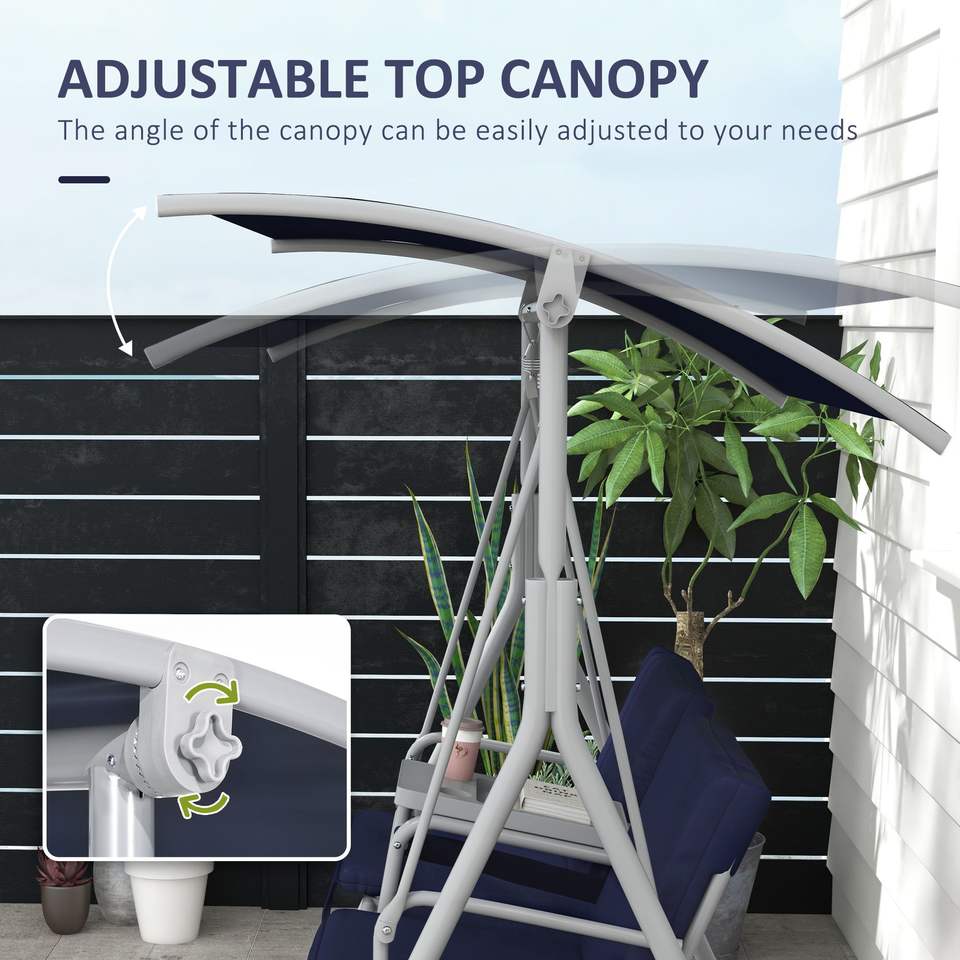 ชิงช้าสำหรับ 2 คน พร้อมขาตั้ง หลังคาสีน้ำเงินเข้ม ที่วางแก้ว และเบาะรองนั่ง สำหรับใช้กลางแจ้งหรือในสวนหลังบ้าน