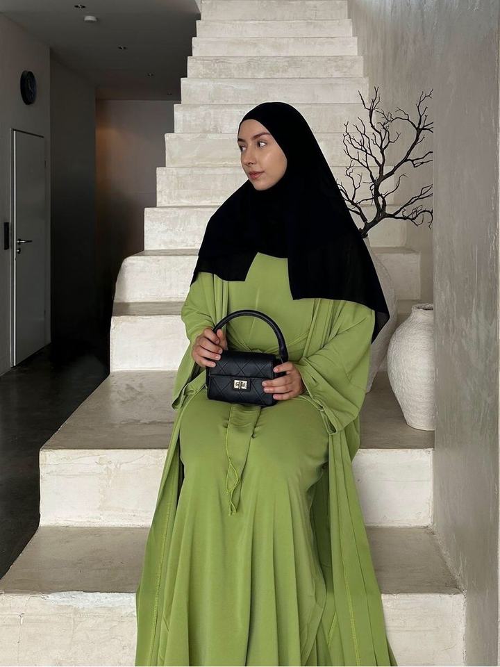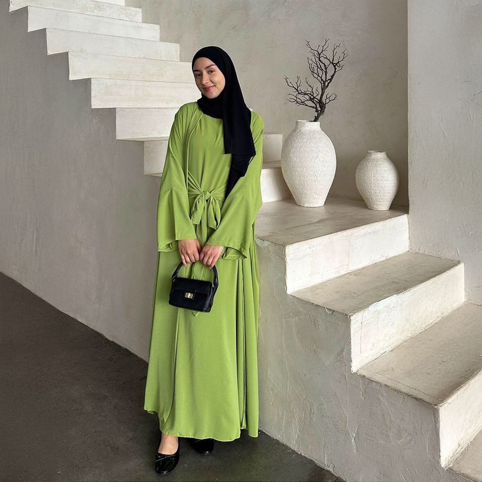 ชุดอาบายะห์ 2 ชิ้น ประกอบด้วยเสื้อคลุมแขนยาวแบบเปิดหน้า 1 ตัว และเดรสผูกเชือกที่คอ 1 ตัว เนื้อผ้าระบายอากาศได้ดี ทรงหลวม สไตล์ ODM ชุดประจำเทศกาลรอมฎอนแบบดั้งเดิม