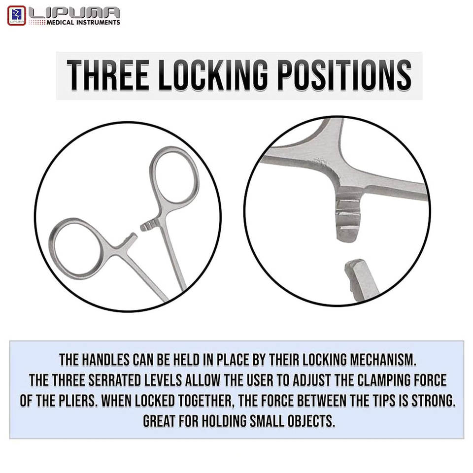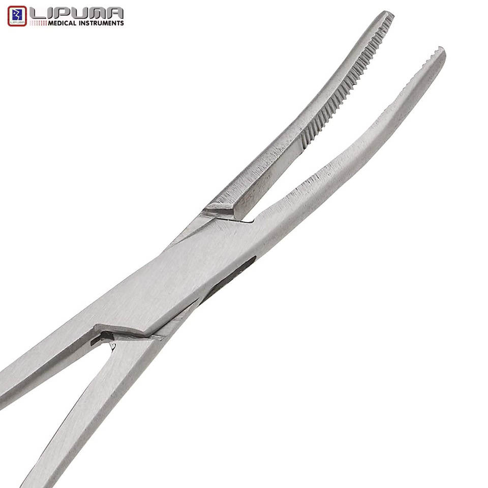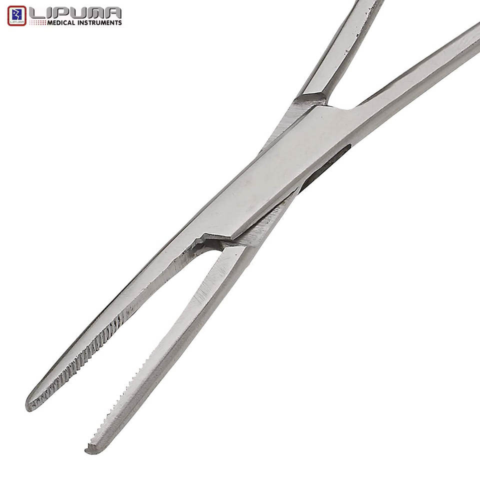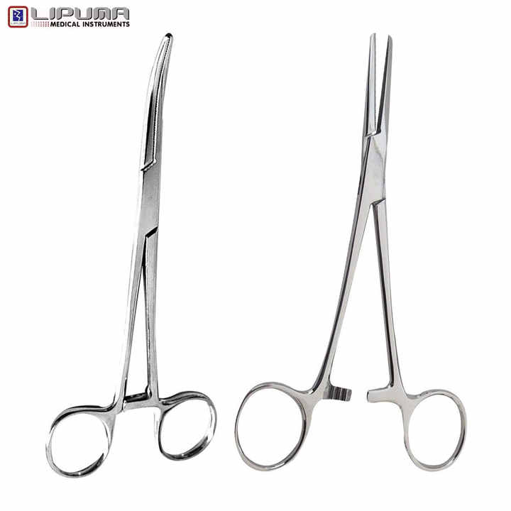 คีมคีลลี่แบบโค้งและตรง 2 ชิ้น ขนาด 8 นิ้ว ทำจากสแตนเลสสตีล พร้อมระบบล็อคแบบแมนนวล สำหรับการผ่าตัดและใช้ทางการแพทย์