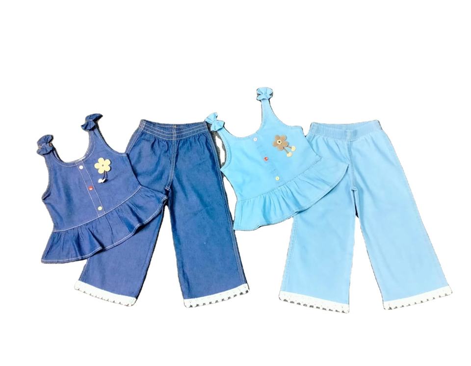 ชุดผ้ายีนส์2ชิ้นแขนเสื้อปะต่อน้อยกว่าเสื้อยีนส์แบบมีสายคาดเอวสำหรับเด็กผู้หญิงเสื้อลำลองเปิดไหล่สำหรับฤดูร้อน