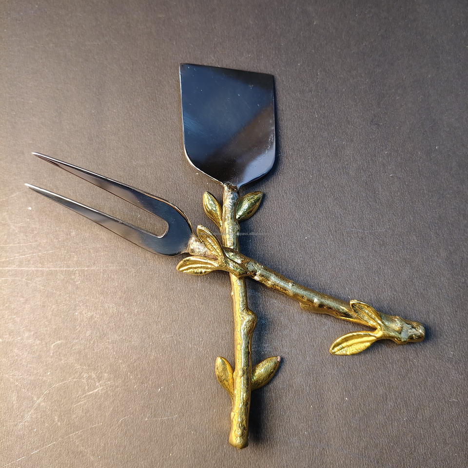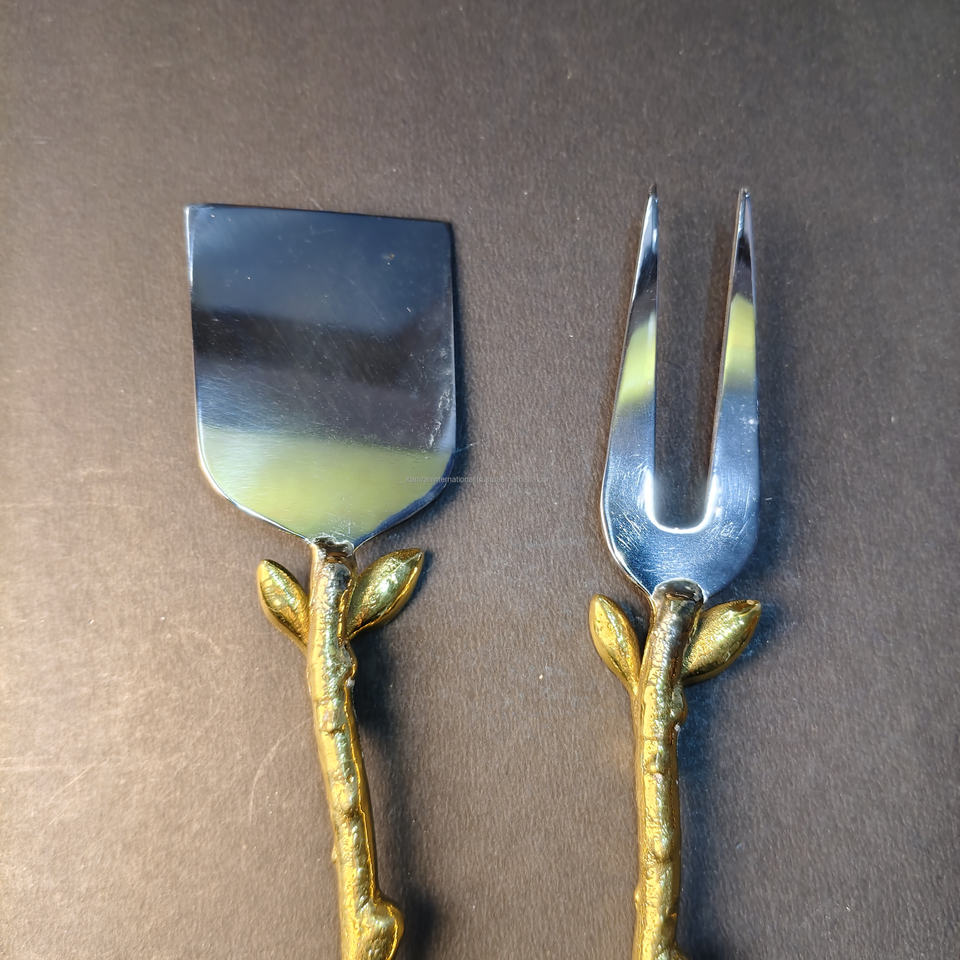 ชุดเสิร์ฟชีสกิ่งไม้ทอง 2 ชิ้น ประกอบด้วย ที่ตักชีสแบบแบน และส้อมเสิร์ฟ พร้อมด้ามจับลายกิ่งไม้