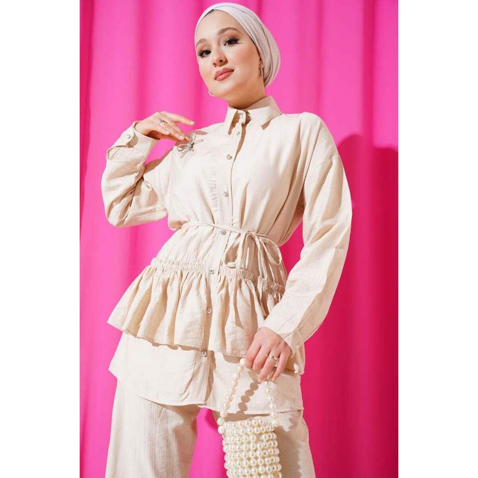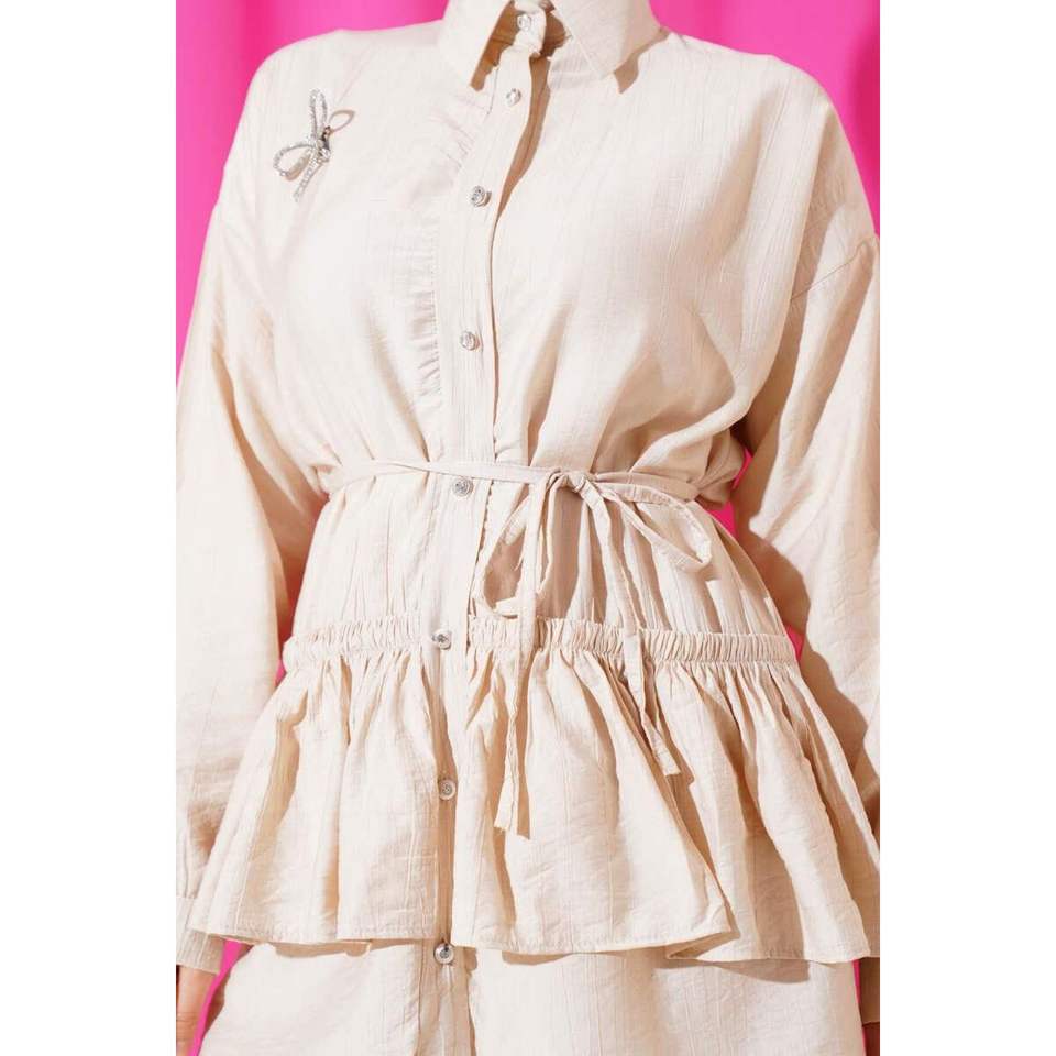 ชุด2ชิ้นพร้อมกระโปรงแต่งระบายและเข็มขัดเชือกสีเบจ