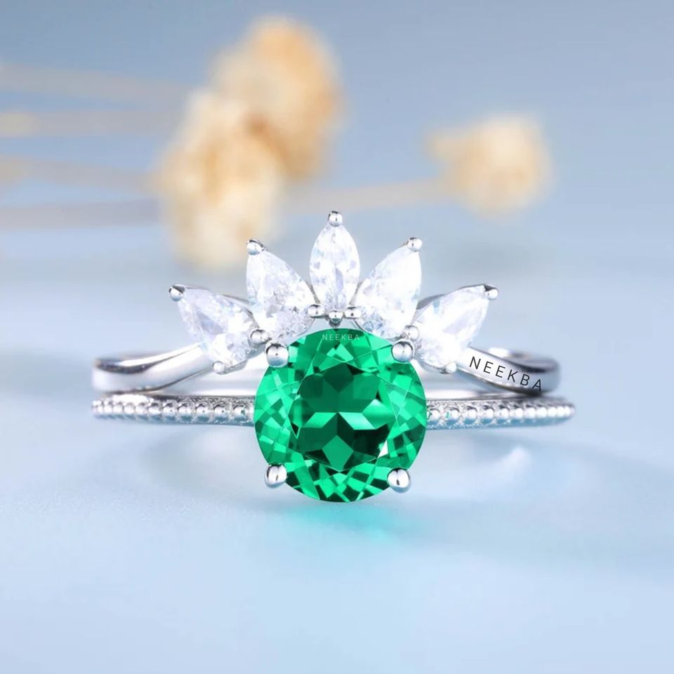 ชุดแหวนแต่งงาน2ชิ้น-แหวนหมั้นมรกตและแหวนแต่งงานแบบโค้ง moisaanite 925สีเงิน