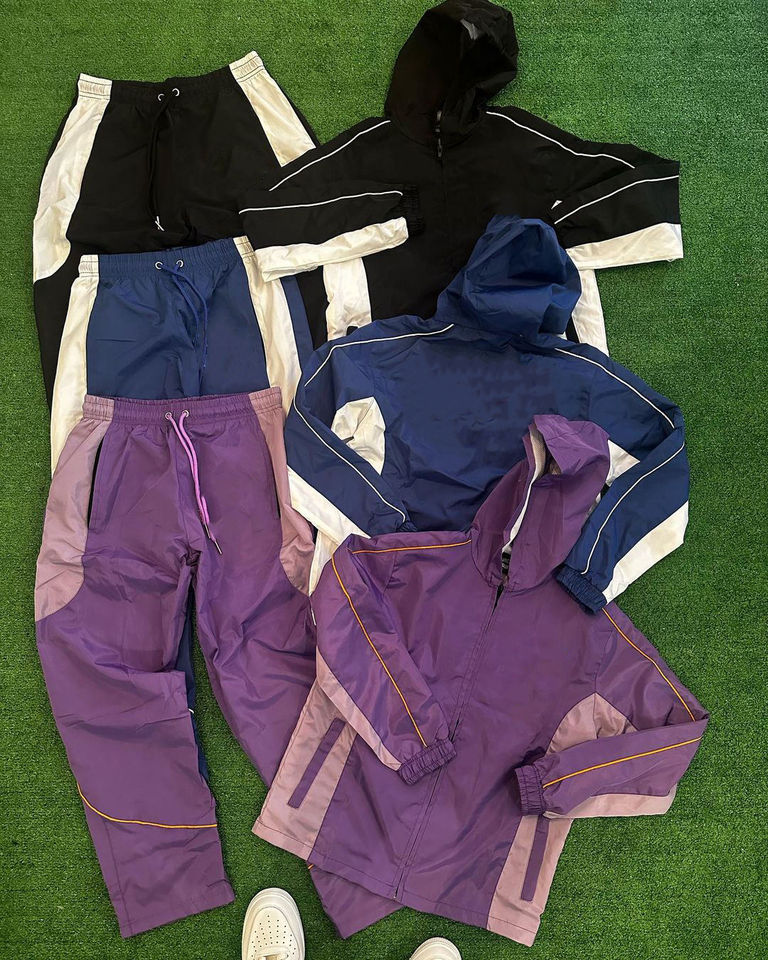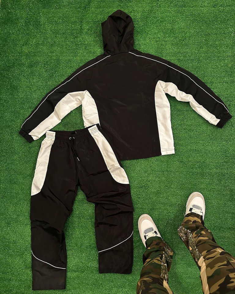 ชุดวอร์มกันลมโอเวอร์ไซส์สำหรับผู้ชาย2ชิ้นเสื้อแจ็กเก็ตแบบมีซิปกางเกงบานผ้าไนลอนสะท้อนแสงดีไซน์ใหม่100%