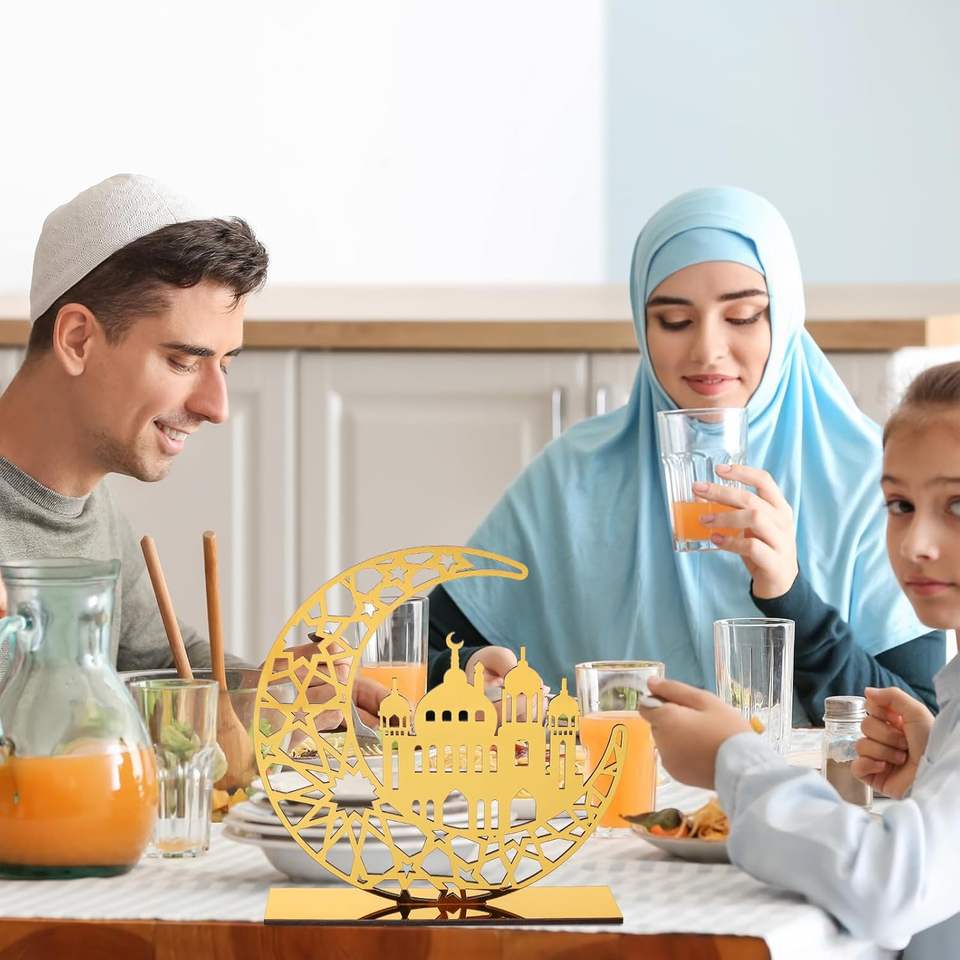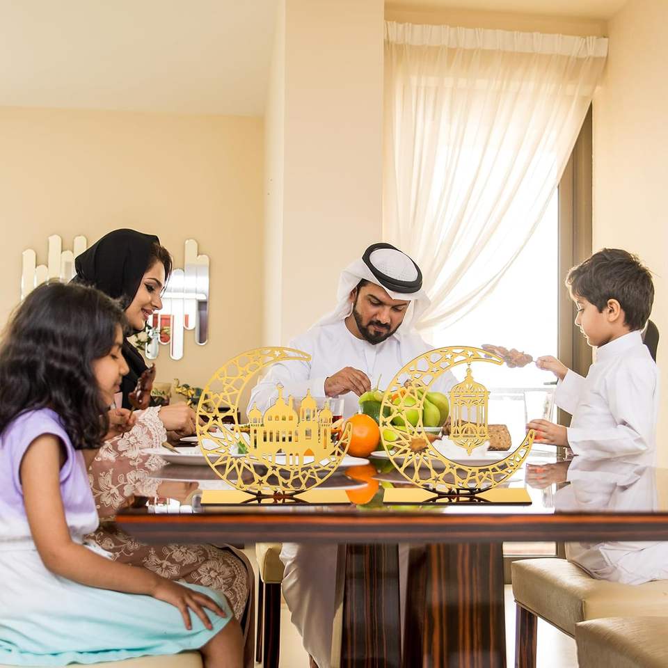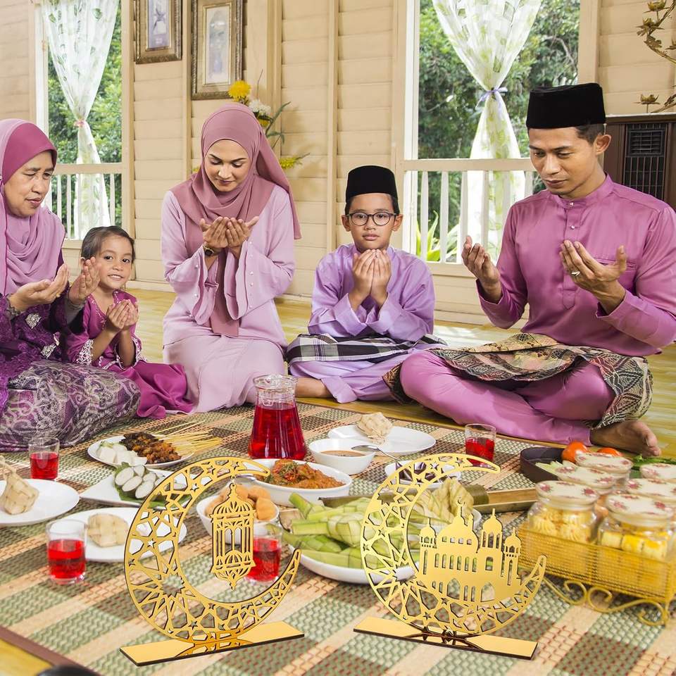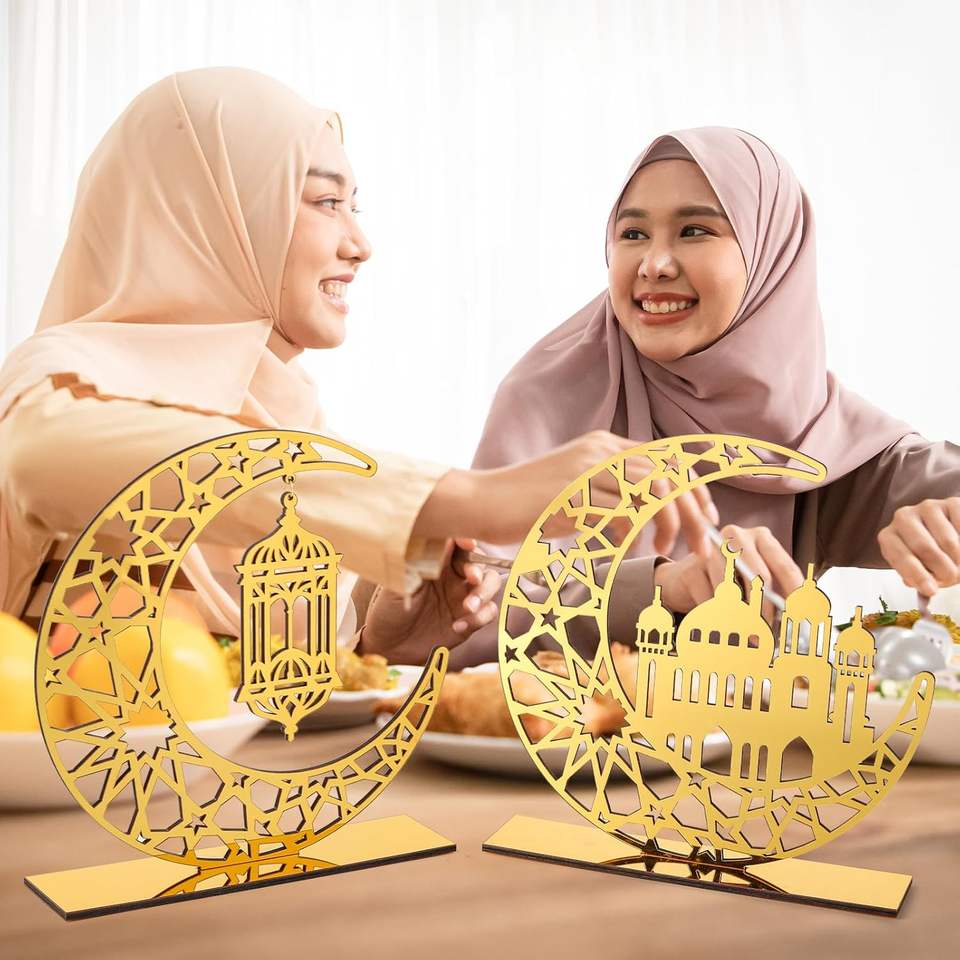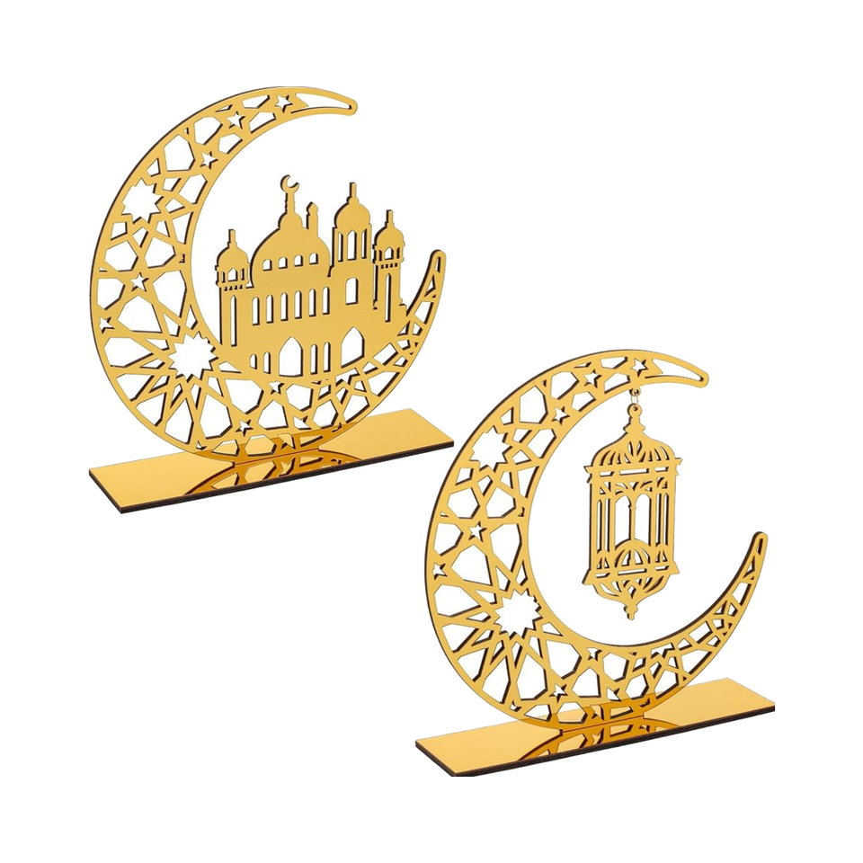 ป้ายอะคริลิคสีทองดวงจันทร์2ชิ้นสำหรับตกแต่งงานปาร์ตี้มุสลิมเครื่องประดับดาวกลวงสำหรับร้านอาหารอิสลาม