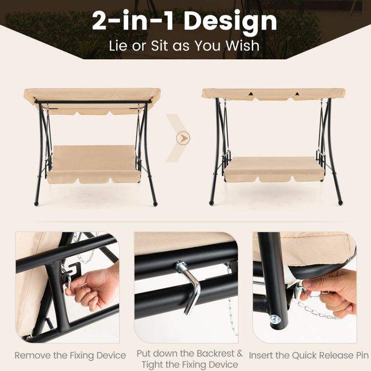2-Seat Convertible Outdoor Swing Chair with Flat Bed and Adjustable Canopy for Patio Use