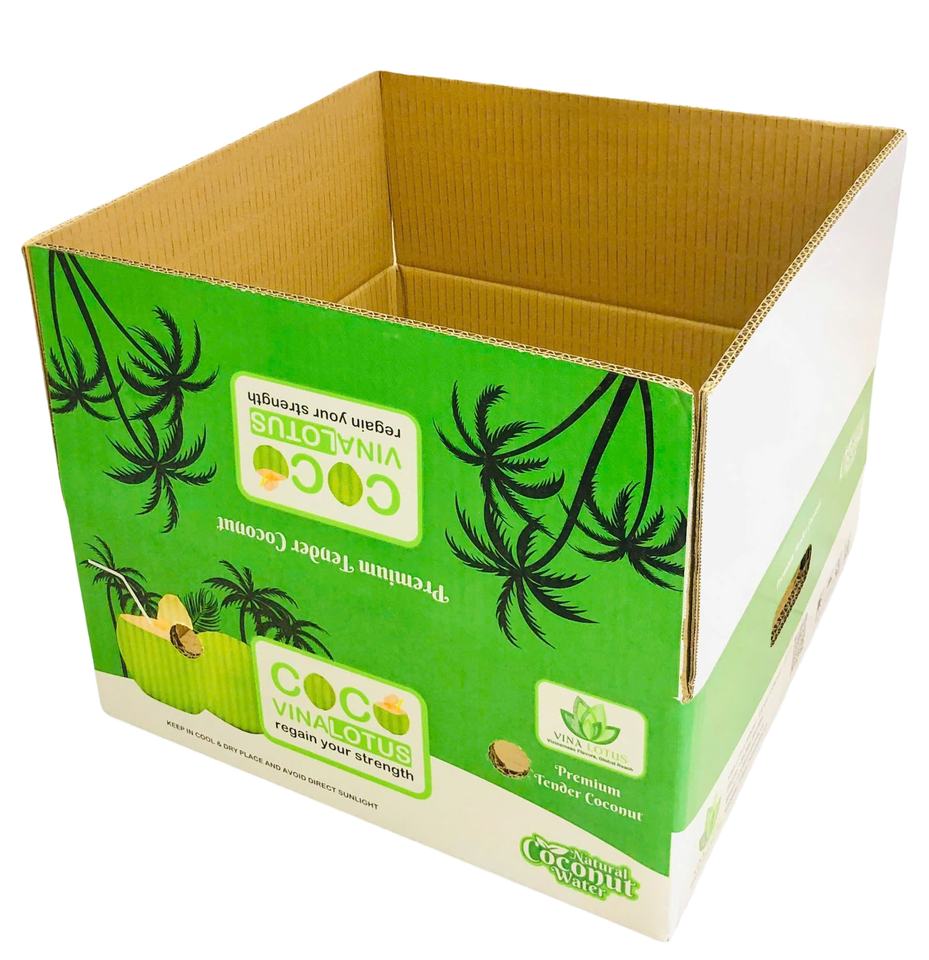 กล่องกระดาษลูกฟูกเคลือบกันน้ำ 2 ด้าน ป้องกันรังสียูวี ผลิตจากวัสดุรีไซเคิล ปลอดภัยสำหรับอาหาร ผลิตในเวียดนาม สำหรับบรรจุภัณฑ์มะพร้าว กล่องกระดาษแข็ง 5 ชั้น สำหรับการเกษตร