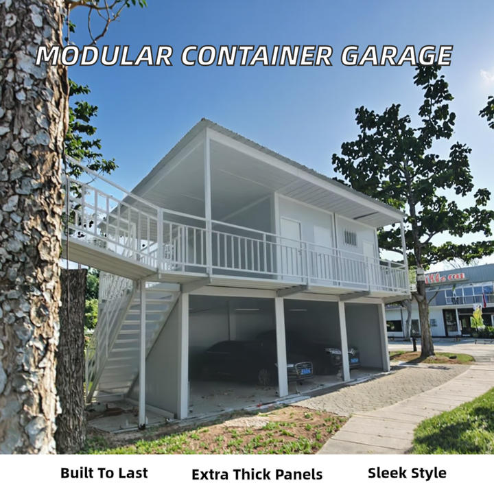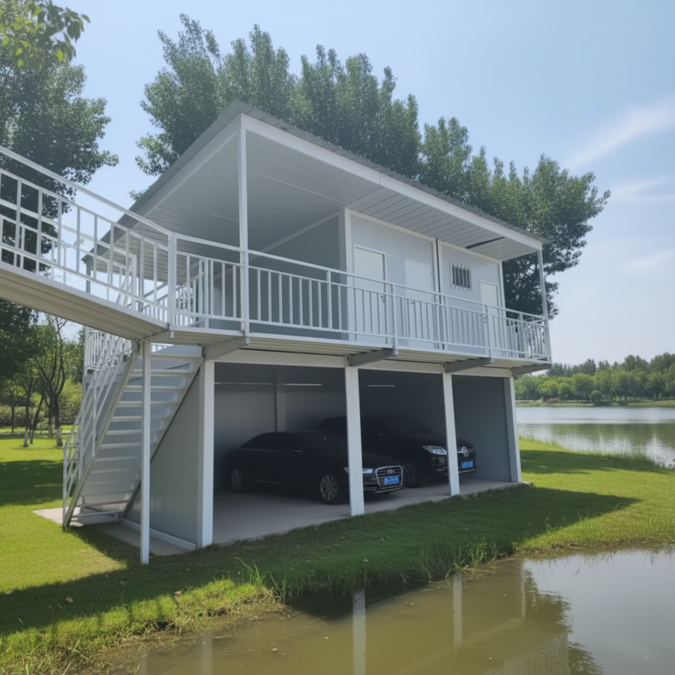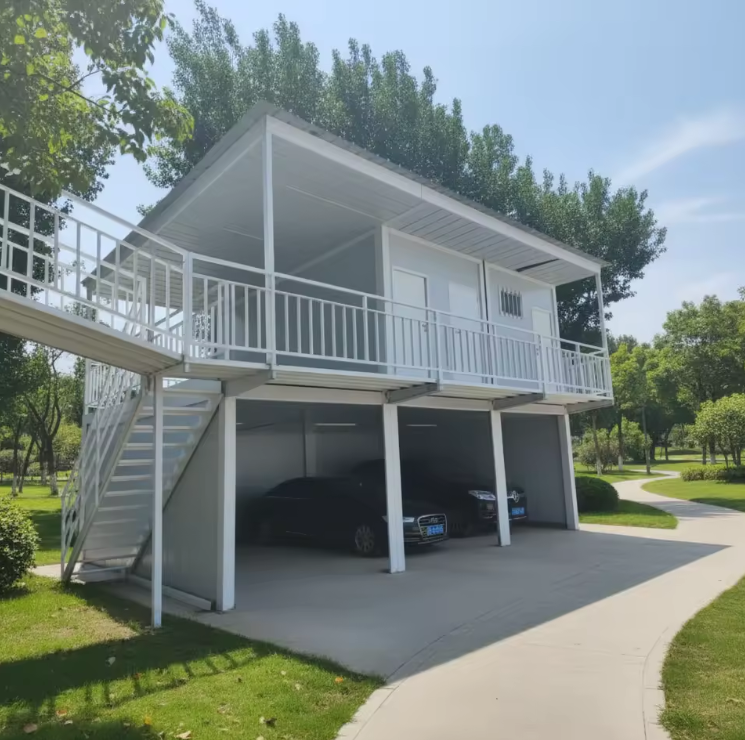 บ้านคอนเทนเนอร์สำเร็จรูปสองชั้นแบบยกพื้น | สำนักงานสำเร็จรูปและพื้นที่อยู่อาศัยพร้อมที่จอดรถ