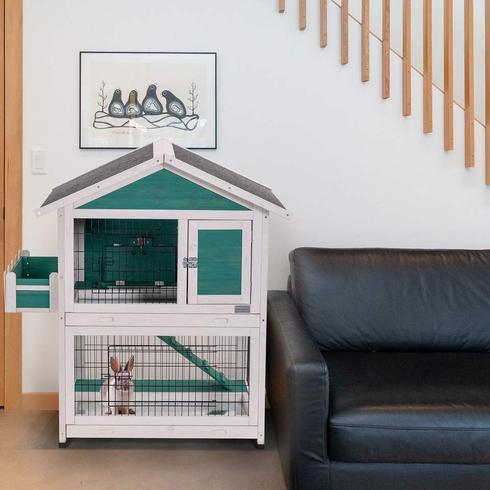 2-Story Rabbit Hutch with Pull-Out Tray Waterproof Roof Indoor or Outdoor Bunny Cage Wooden Pet House Furniture