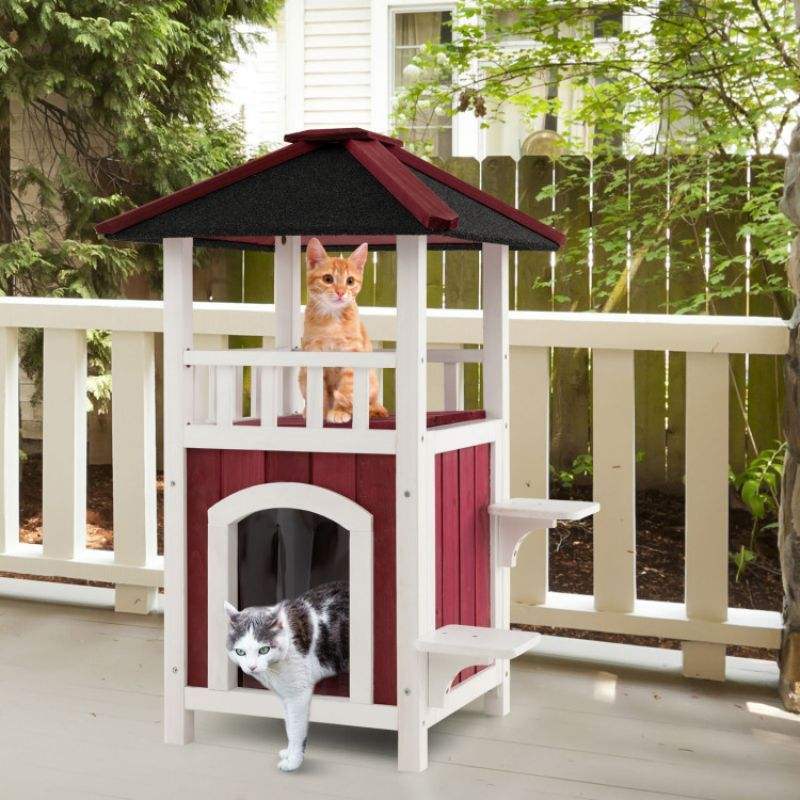 บ้านแมวไม้2ชั้นพร้อมม่านฝนและหลังคายางมะตอยเฟอร์นิเจอร์สัตว์เลี้ยง
