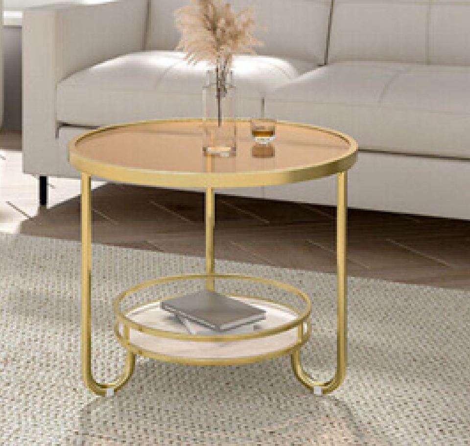 โต๊ะกาแฟทรงกลม2ชั้นมีโต๊ะทรงกลมสีน้ำตาลอ่อนพร้อมกรอบโลหะสีทองจำหน่ายในราคาขายส่ง
