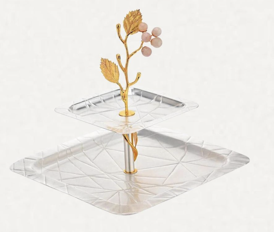 แท่นรองเค้กโลหะแบบพิเศษ2ชั้นพร้อมถาดงูสำหรับงานแต่งงานงานวันเกิดจานทองเหลืองสีเงินสำหรับคัพเค้กผลไม้